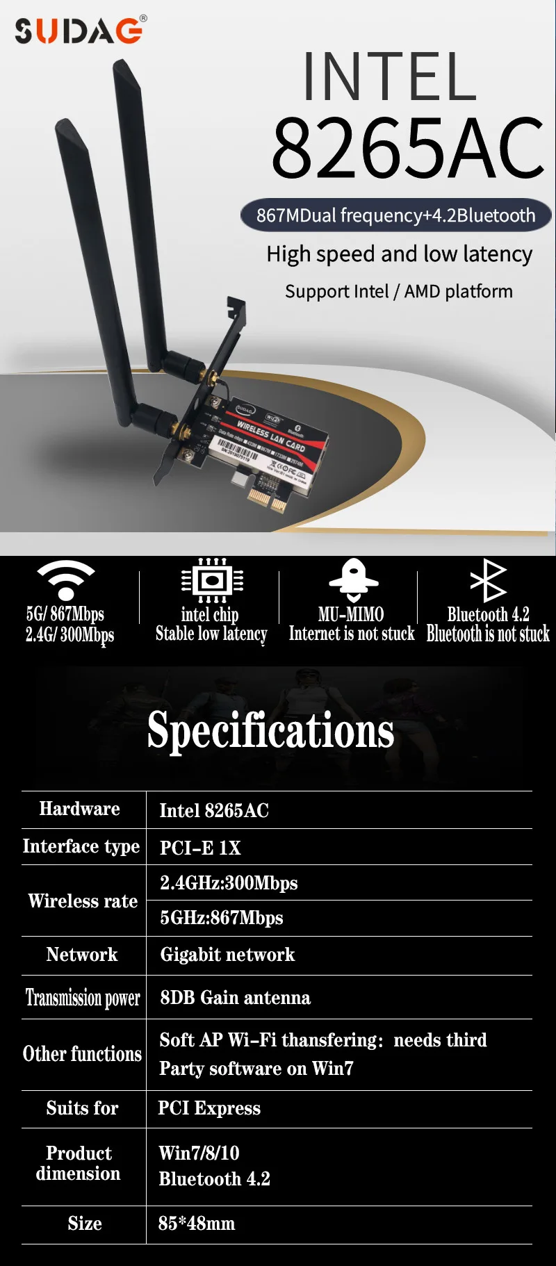 Марка: sudag Modelo: SD-8265 adaptador Wi-Fi de escritorio (ver detalles) Цена: intel 8265 Maga barato Estandar ieee: 802 11ac С Bluetooth 4,2 Banda doble 2,4 ГГц-300 Мбит/с/5ghz-867mbps Nota: velocidade de hasta 867 Мбит/с (roteador el debe admitir 802.11ac) Sitemas operativos: admite individualnyy windows7/8/10/linux Описание: ordenador casi con pci express (ranura pci-e 1x/4x/16x) intertaces
