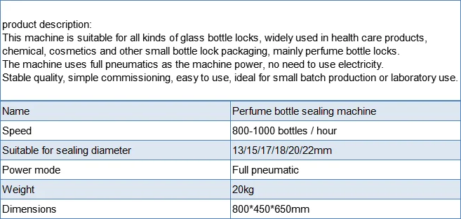 This machine is suitable for all kinds of glass bottle locks, widely used in health care products, chemical, cosmetics and other small bottle lock packaging, mainly perfume bottle locks. The machine uses full pneumatics as the machine power, no need to use electricity. Stable quality, simple commissioning, easy to use, ideal for small batch production or laboratory use.