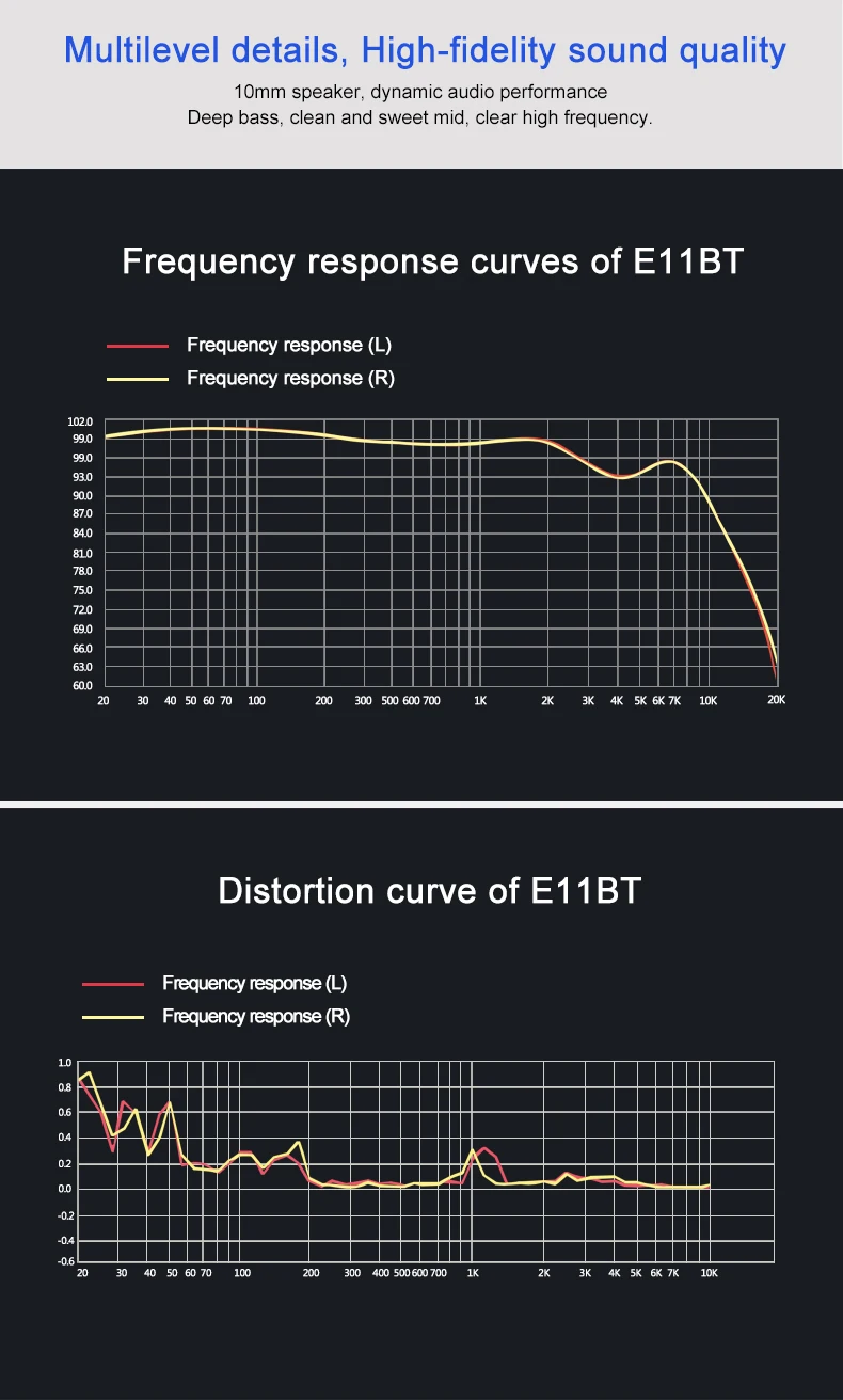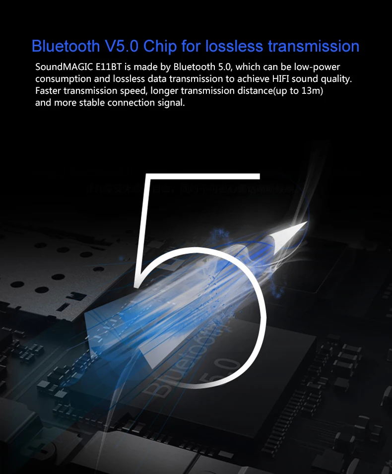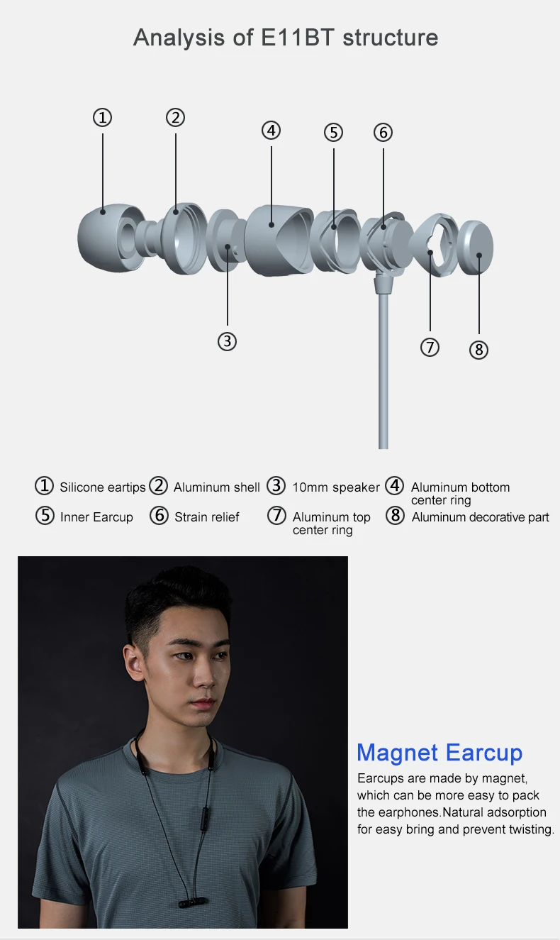Для того чтобы обеспечить мощный и детальный беспроводной Звук от изготовленный на заказ за обновлениями 10 мм динамических излучателя E11BT был оснащен Bluetooth V5.0, AAC, совместимости и внутренние 24-битный ЦАП. Он обеспечивает сбалансированный беспроводной Звук с высокой точностью, стабильным подключением и длительным временем воспроизведения.