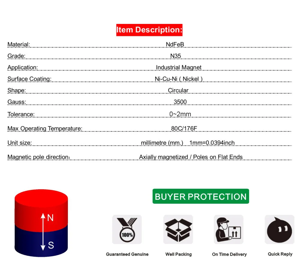 Примечания: 1. Магнит NdFeB продается по размеру, единица измерения-миллиметр, пожалуйста, обратите внимание на размер. 2. Сопутствующие электронные продукты, такие как механические часы, банковские карты, мобильные телефоны, компьютеры, телевизоры, кардиостимуляторы и т. д., на них легко влияют неодимовые магниты, пожалуйста, держите определенное расстояние, чтобы избежать ненужных потерь. 3. При подключении двух магнитов медленно и аккуратно притягивайте их близко друг к другу. Жесткое измельчение приведет к повреждению и трещинам в магнитном материале, магнит NdFeB обладает невероятными магнитными свойствами, не повреждает руки при использовании 4. Неодимовые магниты хрупкие, особенно для лент и листов большого размера, пожалуйста, слегка положите их и осторожно шатайте магниты при разделении. 5. Держите магнит подальше от высоких температур и агрессивной среды, хотя на поверхности магнита есть покрытие. 6. Все изображения продукта предназначены только для справки. Цвет и блеск продукта, пожалуйста, обратите внимание на полученные товары! 7. Если у вас есть какие-либо вопросы, пожалуйста, продолжайте общаться с нами.