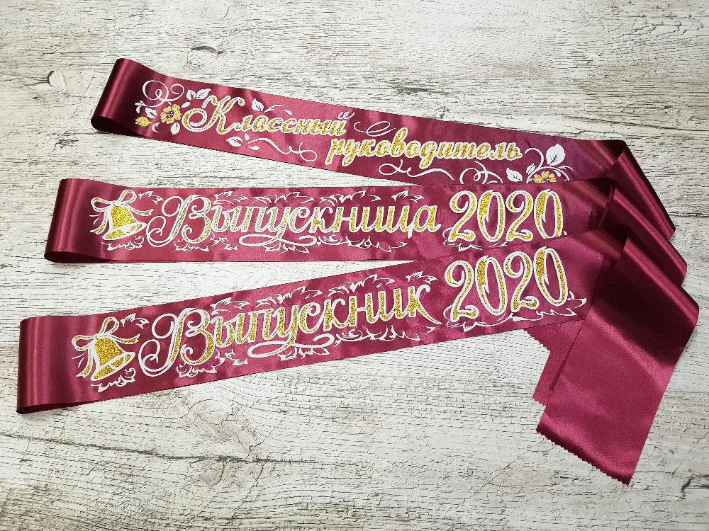 Атласные выпускные ленты с объёмной надписью. Надпись на лента нанесена по специальной технологии, за счёт которой создаётся "3D" эффект, и получается лента выпускника с двойной надписью. Основной цвет нанесён глитером (блёстками), а внешний край белой вспененной краской.