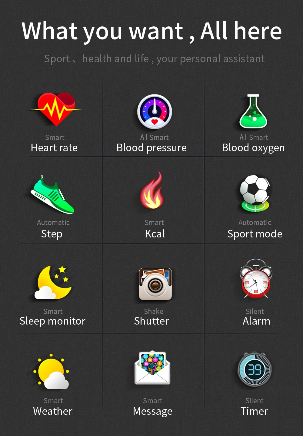 . Простой, роскошный светильник. Спортивный, деловой, пульсометр I, кровяное давление, кислород I IP68 водонепроницаемый . . Что вы хотите, все здесь, спорт, здоровье и жизнь, ваш личный помощник Пульсометр/артериальное давление/Кислород крови/шаг/ккал/спортивный режим/монитор сна/затвор/Будильник/Погода/сообщения/таймер Сенсорный дисплей. Физической кнопкой. Используйте так легко сенсорный дисплей: 1. Слайд до просмотра сообщений 2. Слайд, чтобы переключить функцию 3. Stid слева, чтобы отобразить другое функциональное меню 4. Верните права, чтобы вернуть предыдущий уровень. Кнопка: 1, нажмите и удерживайте в течение 3 секунд, чтобы начать 2. Короткое нажатие, чтобы вернуть предыдущий уровень 3. Нажмите и удерживайте в течение 3 секунд, чтобы выключить. Цветной экран HD. Превосходный процесс 2.5D устойчивый к царапинам и износостойкий экран, Безель с покрытием из нержавеющей стали 316L