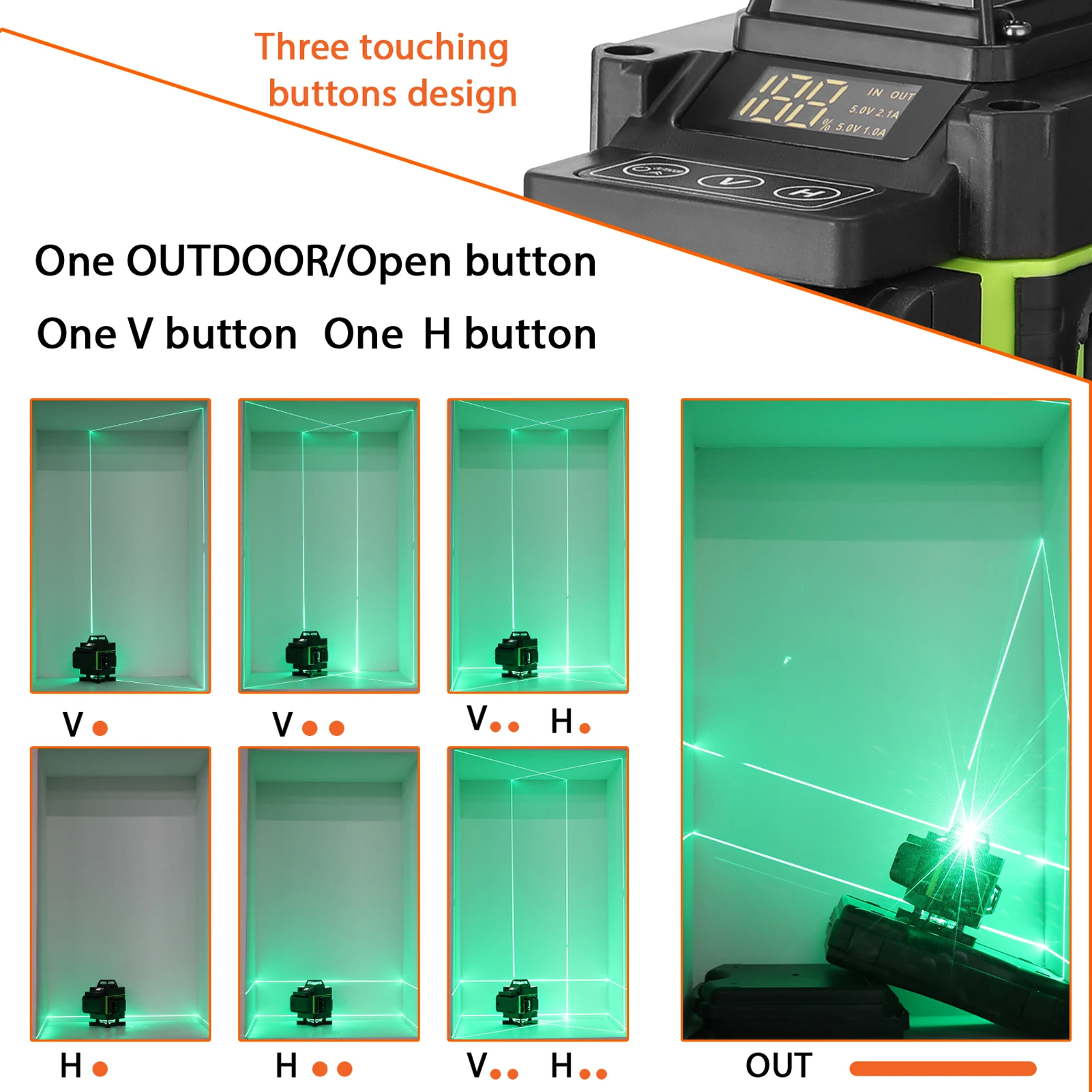 Output 12 laser lines for finer positioning, with self-leveling system, flexibility and stability.