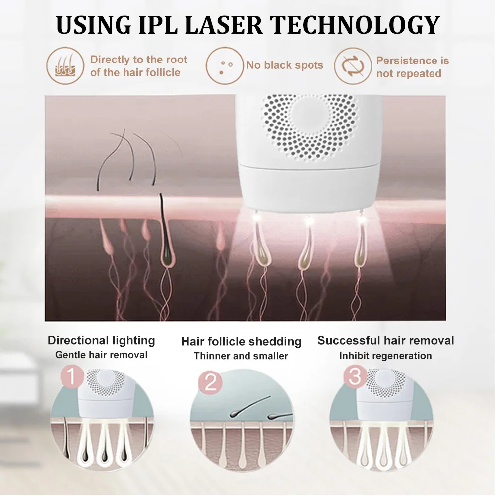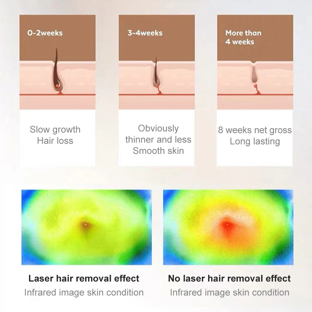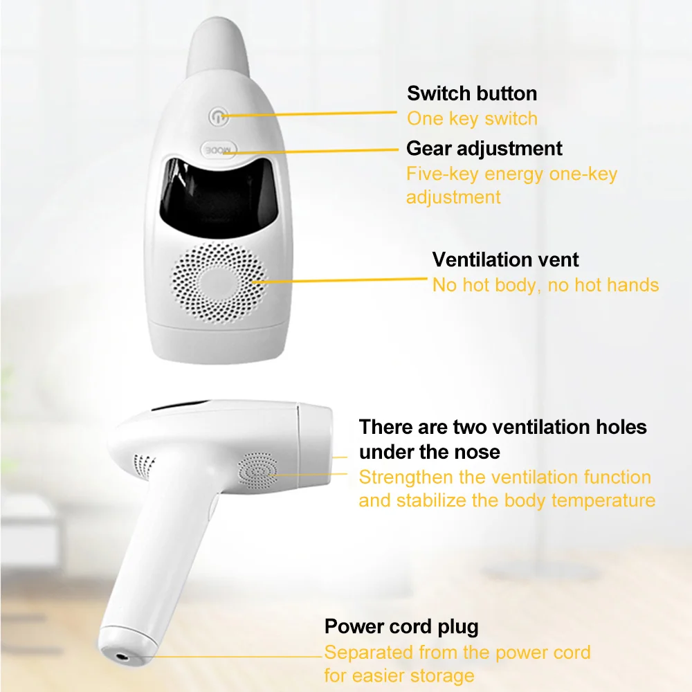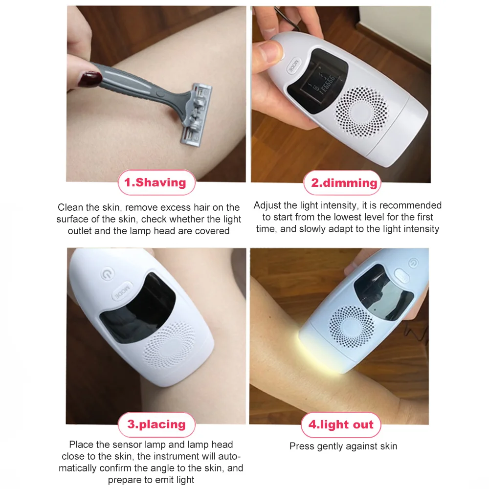 2. Технология IPL-благодаря своей встроенной технологии интенсивного импульсного светильник, устройство для удаления волос IPL является эффективным и безболезненным. Светильник IPL поглощается меланином в волосяном фолликуле ниже кожи и может подавлять рост волос. Отсутствие стимуляции, повреждения, длительное и нежное торможение роста волос, придаст вам новый опыт эффективного и комфортного удаления волос.