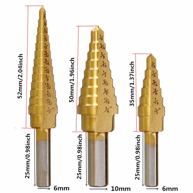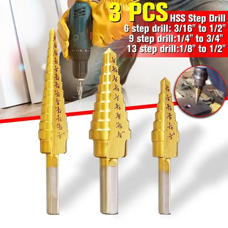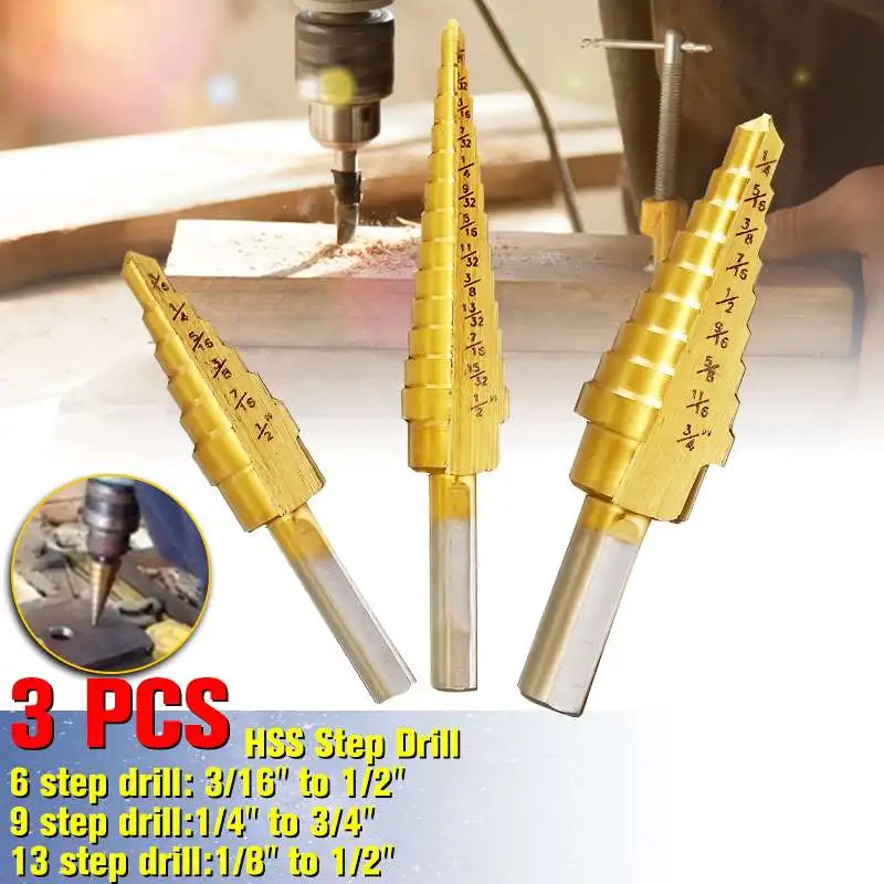 3 шт., ступенчатые сверла с титановым покрытием, 3/16-1/2, 1/8-1/2, 1/4-3/4 дюйма