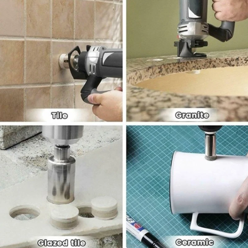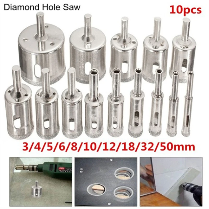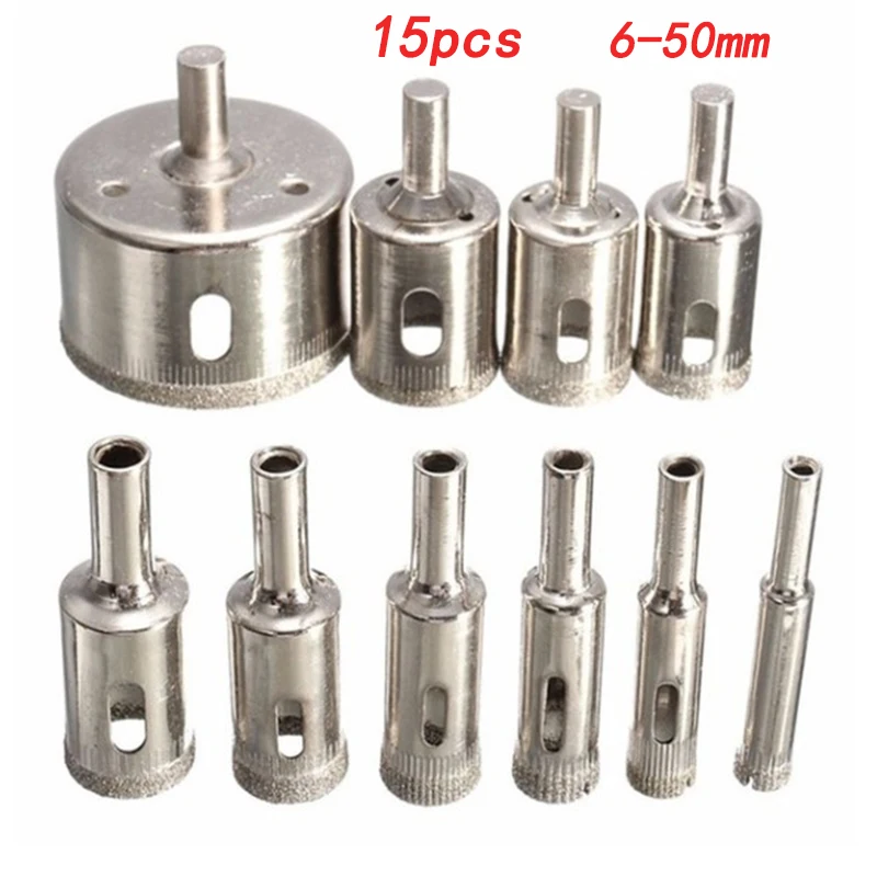 Emery glass drill bit, diamond, marble hole opener specification: Brand new Length: about 55mm Color: as shown Material: galvanized diamond Production process: electroplating: Diameter range: 3-60mm 10pcs including: 3/4/5/6/8/10/12/18/32/50mm 15Pcs includes: 6-50mm Quantity: 10Pcs/set ,15pcs/set Good performance and long life Very suitable for drilling clean and precise holes in glass and tiles Best results when used with an electric drill
