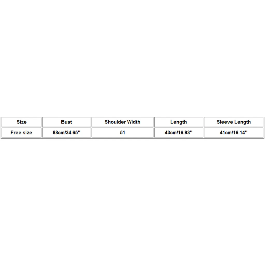 | Размер: свободный размер | Обхват груди: 88 см/34,65 дюйма | Ширина плеч: 51 | Длина: 43 см/16,93'' | Длина рукава: 41 см/16,14 дюйма |