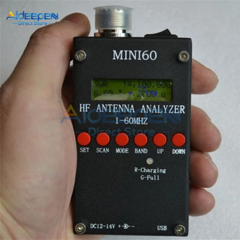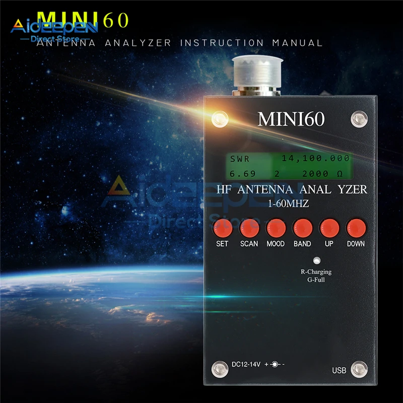 1. Мини60 Краткое Описание параметровДиапазон воспроизводимых частот: 1-60 МГцСопротивление источника сигнала: 50 ОмСтабильность: +/-100 ppmСпектральная чистота: гармоническая>-TBD dB 60 МГцДлина полосы: 100 Гц, 1 кГц, 10 кГц, 100 кГцКоэффициент стоячей волны: 1-9,99Тестовое сопротивление: 5-2000омВыход: 2,0 Вольт pp (Typ)Встроенный полимерный аккумулятор: литиевая батарея 3,7 в (без батареи)Емкость аккумулятора: 1600 мААдаптер для зарядки: DC12-14V,500mAЗарядка через USB-интерфейс: 5 В, 300 мАРазмер: 53 мм X 25 мм X 105 мм (с антенной)Вес: 200 г 2. Функциональные клавиши объясняютКомплект: SCAN: режим: