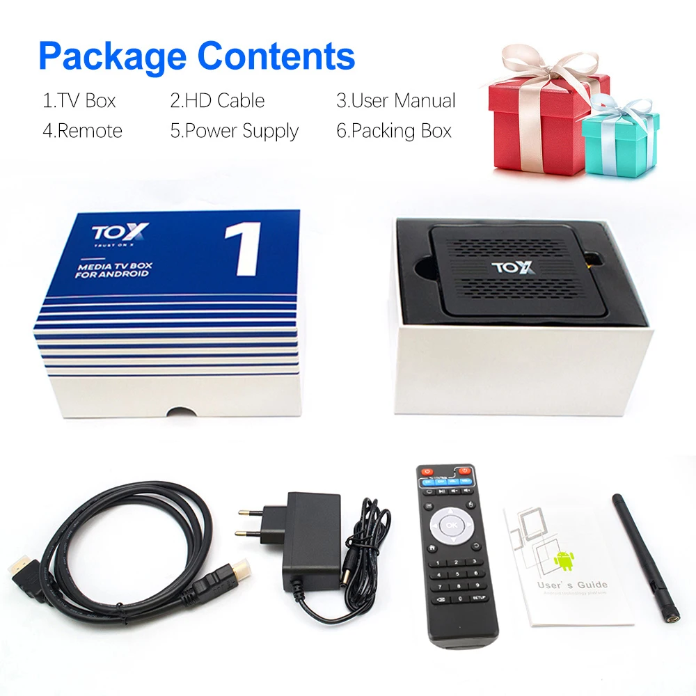 1 * TOX1ТВ-приставка Android 9.01 * Адаптер питания1 * Руководство пользователя1 * HD кабель1 * пульт дистанционного управления