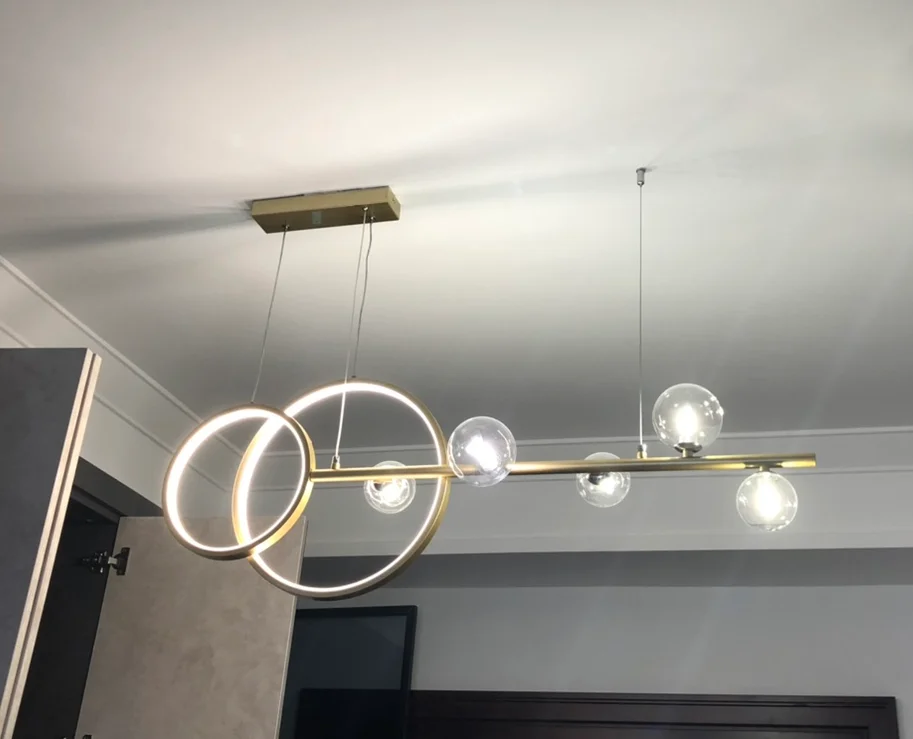 1. Тип изделия: светодиодный подвесной светильник 2. Материал: железо, стекло 3. Размер: Длина 100 см 4. Базовый тип: светодиодный (Примечание: включает лампу!) 5. Цвет корпуса: черный/золотой 6. Напряжение: AC90-260V (подходит для всех стран!) 7. Применение: отель, Ресторан, Бар, лобби, офис, гостиная, столовая и т. Д. Три цвета затемнения: Есть три цветовых температуры, которые можно переключать (Теплый светильник, нейтральный светильник, холодный белый светильник). Через настенный выключатель, непрерывное включение и выключение для переключения цветовой температуры.