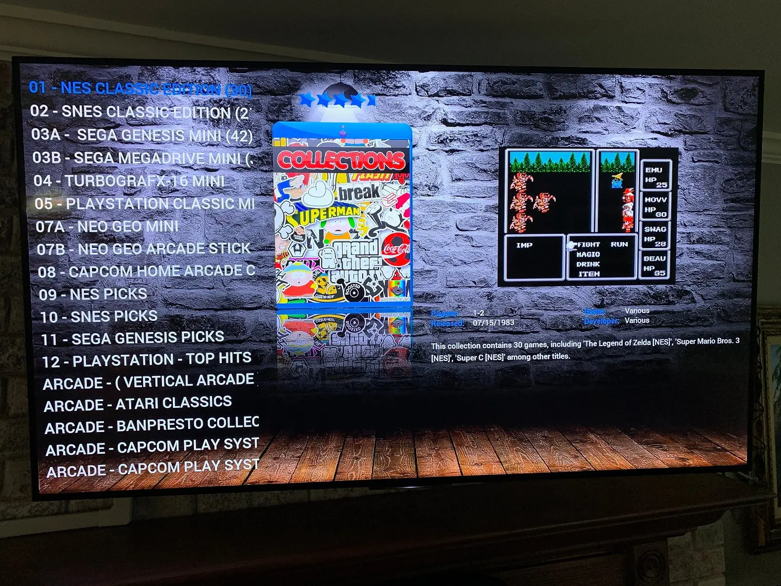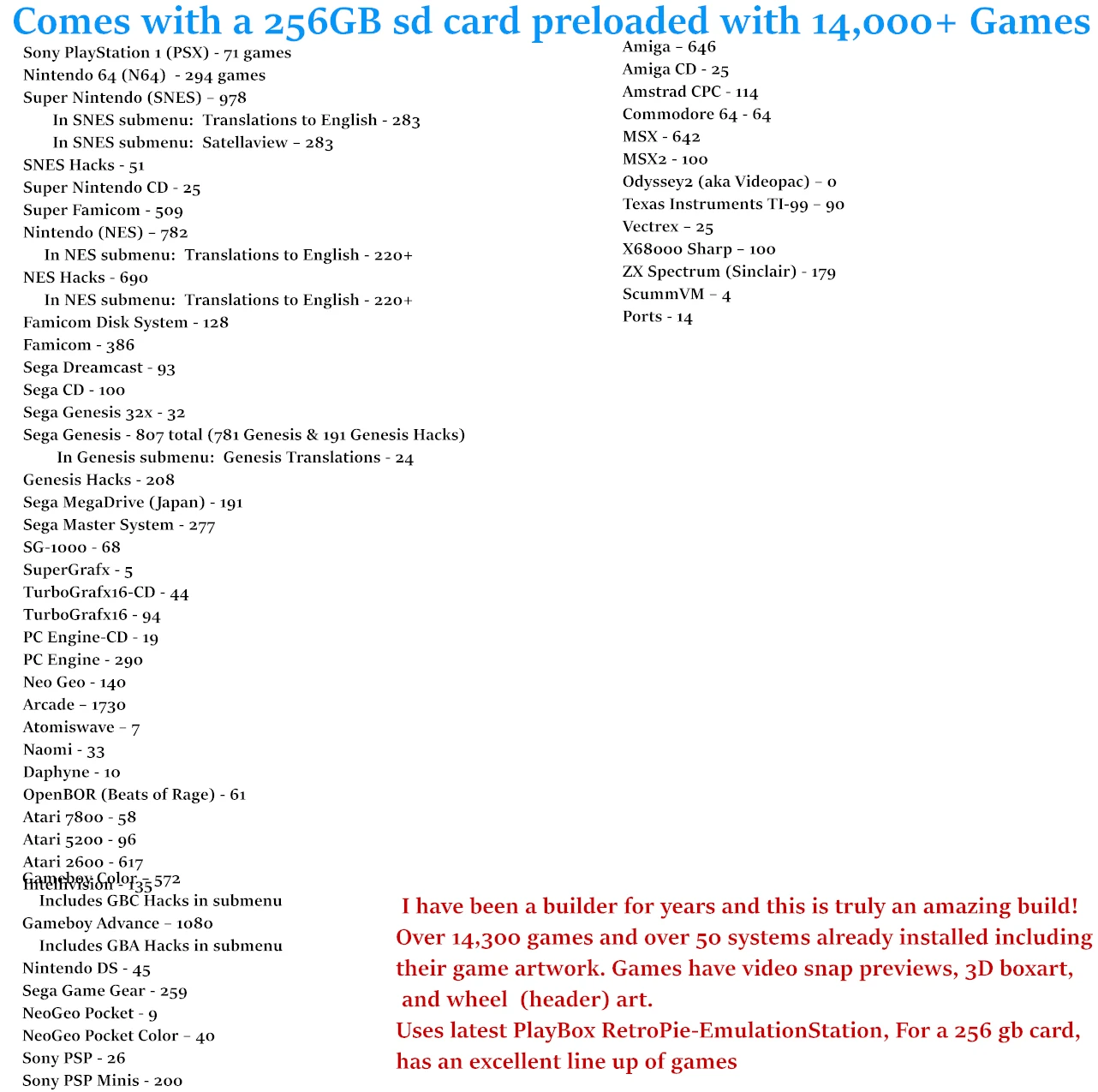 Игры имеют видео оснастки предварительного просмотра, 3D boxart и колесо (заголовок) искусства. Использует последнюю версию PlayBox RetroPie-EmulationStation, для карты 256 ГБ, имеет отличную линейку игр; Премиум видео предварительный просмотр для аркадных и неогео; Более организованный список систем от производителя, домашние консоли, ручники, компьютерные системы и коллекции; Включен выбор эмулятора меню на загрузке игры, лучшие предварительно загруженные темы;