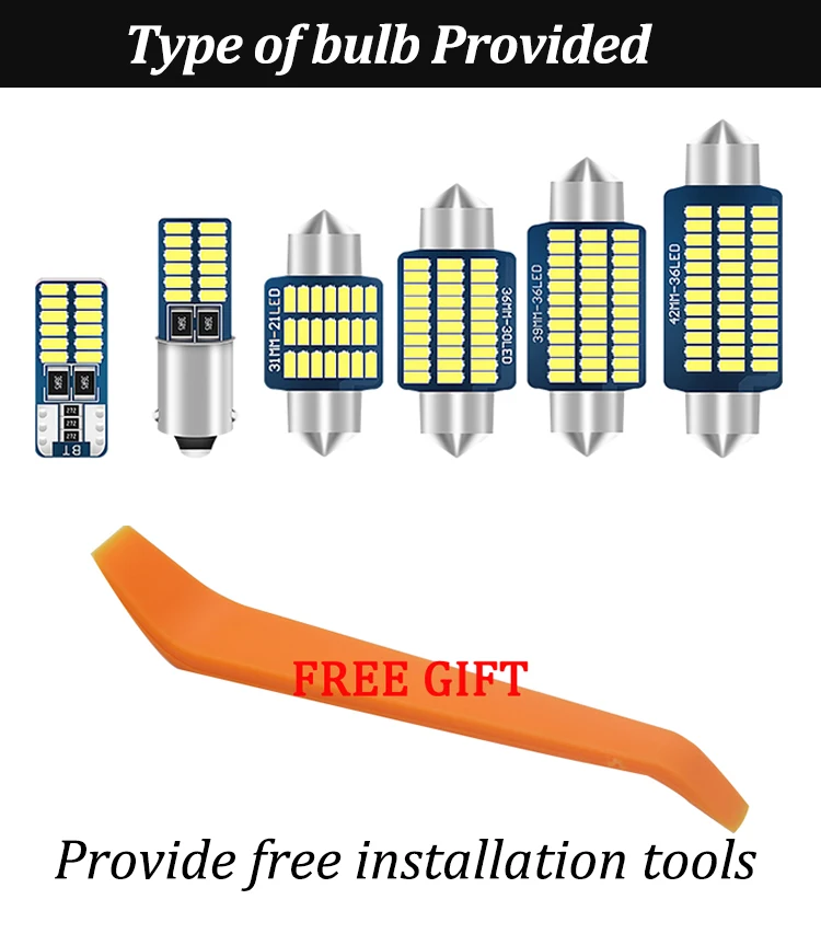 ▶ Provides these bright Error Free LED bulbs, perfect replacement of the original bulbs, it makes a much brighter interior lighting for your car. ▶ All LED bulbs are 100% Canbus Error Free Plug and play, with no modification needed. ▶ Product pictures are for LED bulb type reference only, we will provide compatible LED interior light kits according to the your car.