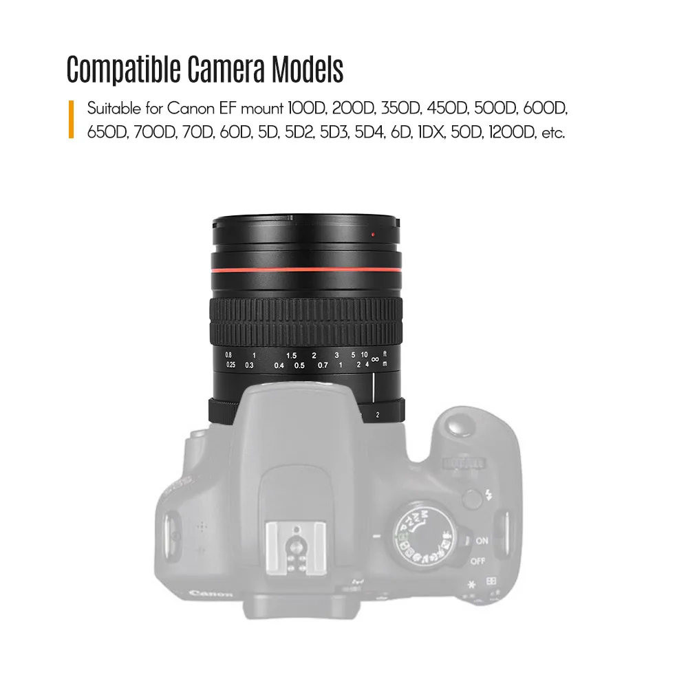 Совместимая модель камеры:Для Canon EF mount 100D, 200D, 350D, 450D, 500D, 600D, 650D, 700D, 70D, 60D, 5D, 5D2, 5D3, 5D4, 6D, 1DX, 50D, 1200D, И т. д.
