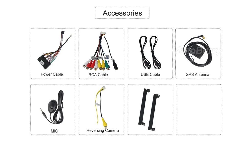 Один кабель RCA с внешним входом микрофона, один кабель камеры заднего вида с Wi-Fi и сигнальными кабелями BT, один антенный кабель GPS, два usb-кабеля, один установочный инструмент и один внешний микрофон в качестве подарка