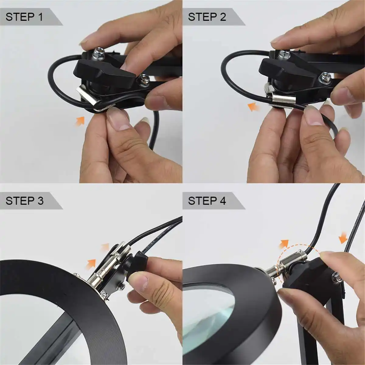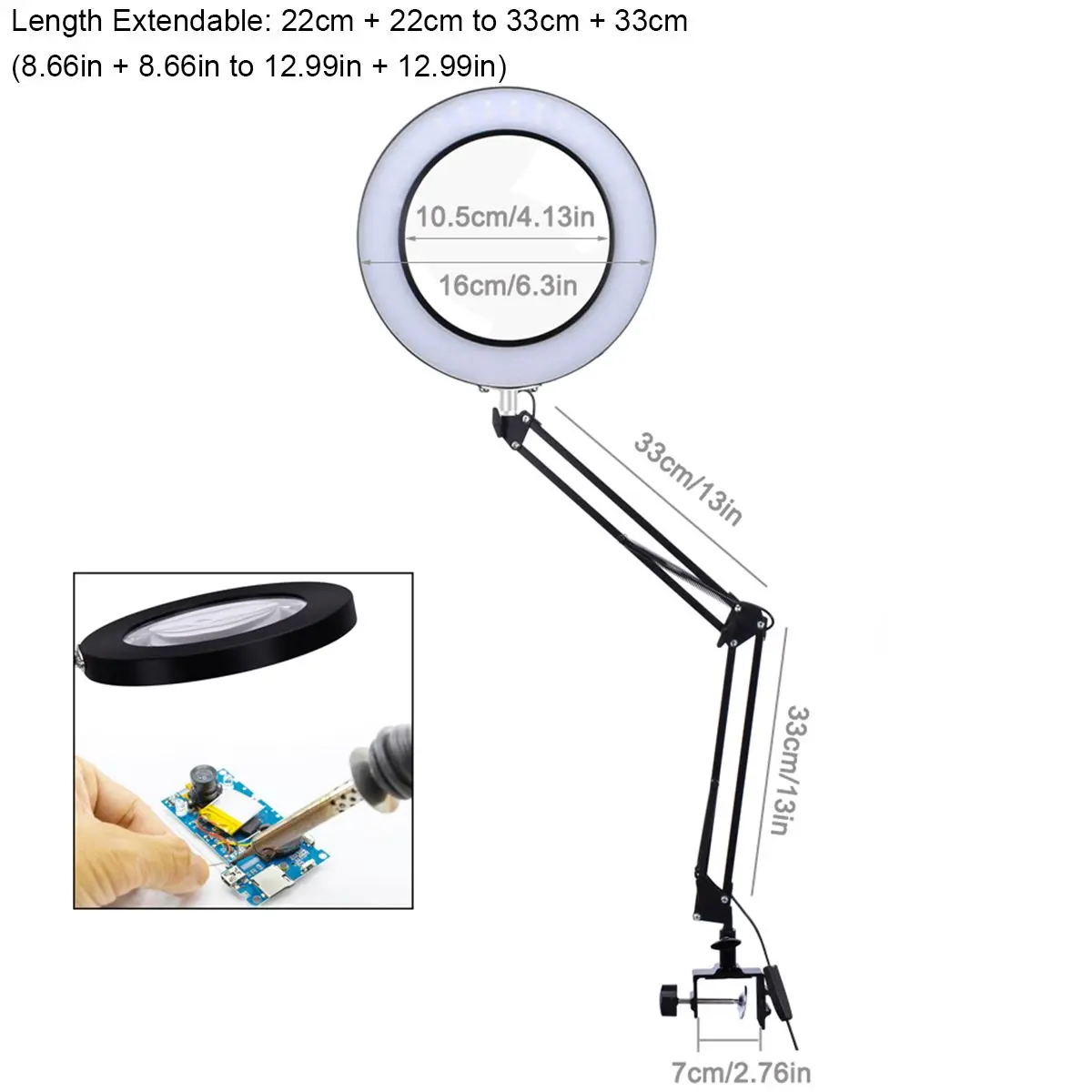 Особенности: 1. Прочный металлический зажим может быть закреплен на любую плоскую поверхность, которая составляет менее 6,5 см/2,56В(Макс.) толстый. Экономит место, удобно крепится к столу, верстаку. 2. Головку лампы можно отрегулировать на 220 ° вверх и вниз и поворачивать на 360 °. 22 см + 22 см (33 см + 33 см) выдвижные длинные руки, можно регулировать на 180 °/135 °. 3. Увеличительное стекло с светодиодный светильник, цветовая температура светодиодный светильник можно отрегулировать в 3 шага и яркость можно отрегулировать в 10Шаги, они могут соответствовать различным условиям работы. 4. Подходит для чтения рабочих/компьютерных досок/ювелирных изделий/ремесел любителей/сварочных работ/ухода за кожей красоты, он может быть использован универсально.