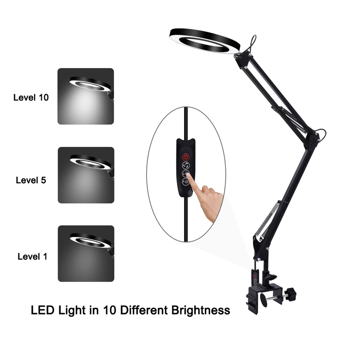 Характеристики: Увеличительное стекло несколько: 5X светодиодный увеличительное стекло Светодиодный: 60 SMD светодиодный светильник BПравота: В 10 различных яркости Объектив Диаметр: 10,5 см/4,13В Длина: 22 см + 22 см до 33 см + 33 см (8,66 дюйма + 8,66 дюйма до 12,99 дюйма + 12,99 дюйма) Затемнение: плавное затемнение; 3 цветовых режима Адпатер постоянного тока: 5 В 2 А Вес: прибл. 1,05 кг
