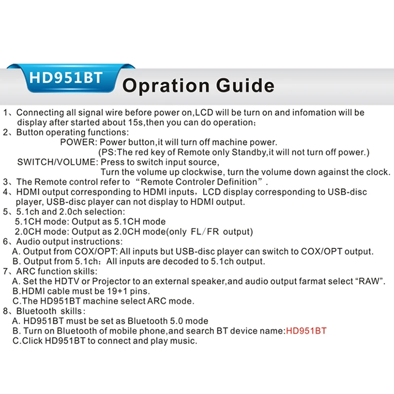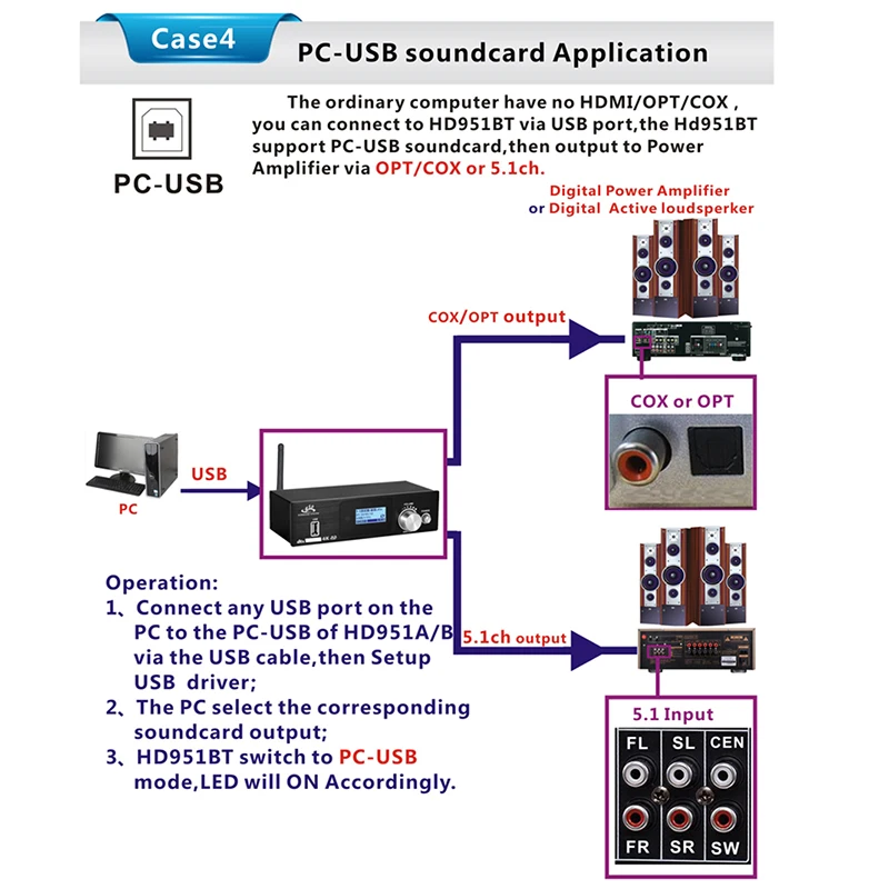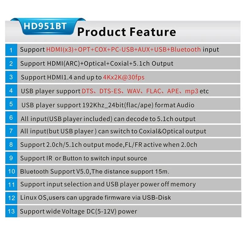 3: все источники сигнала (HDMI/ARC/COXIAL/OPTICAL/PC-USB/AUX/USB) могут декодировать до 5.1ch выход.