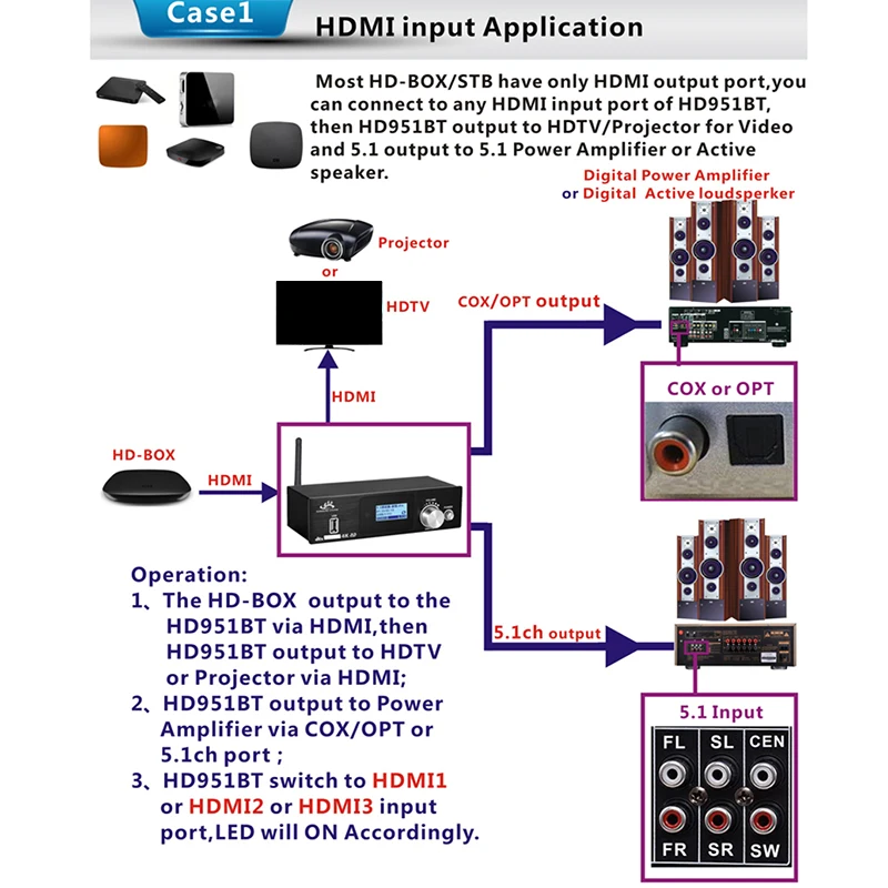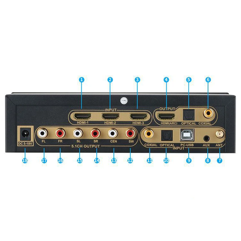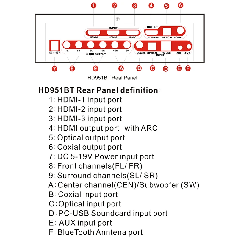 1: Поддержка HDMI(x3)+ коаксиальный + оптический + PC-USB + AUX + USB 2,0 + Bluetooth V5.0 вход.