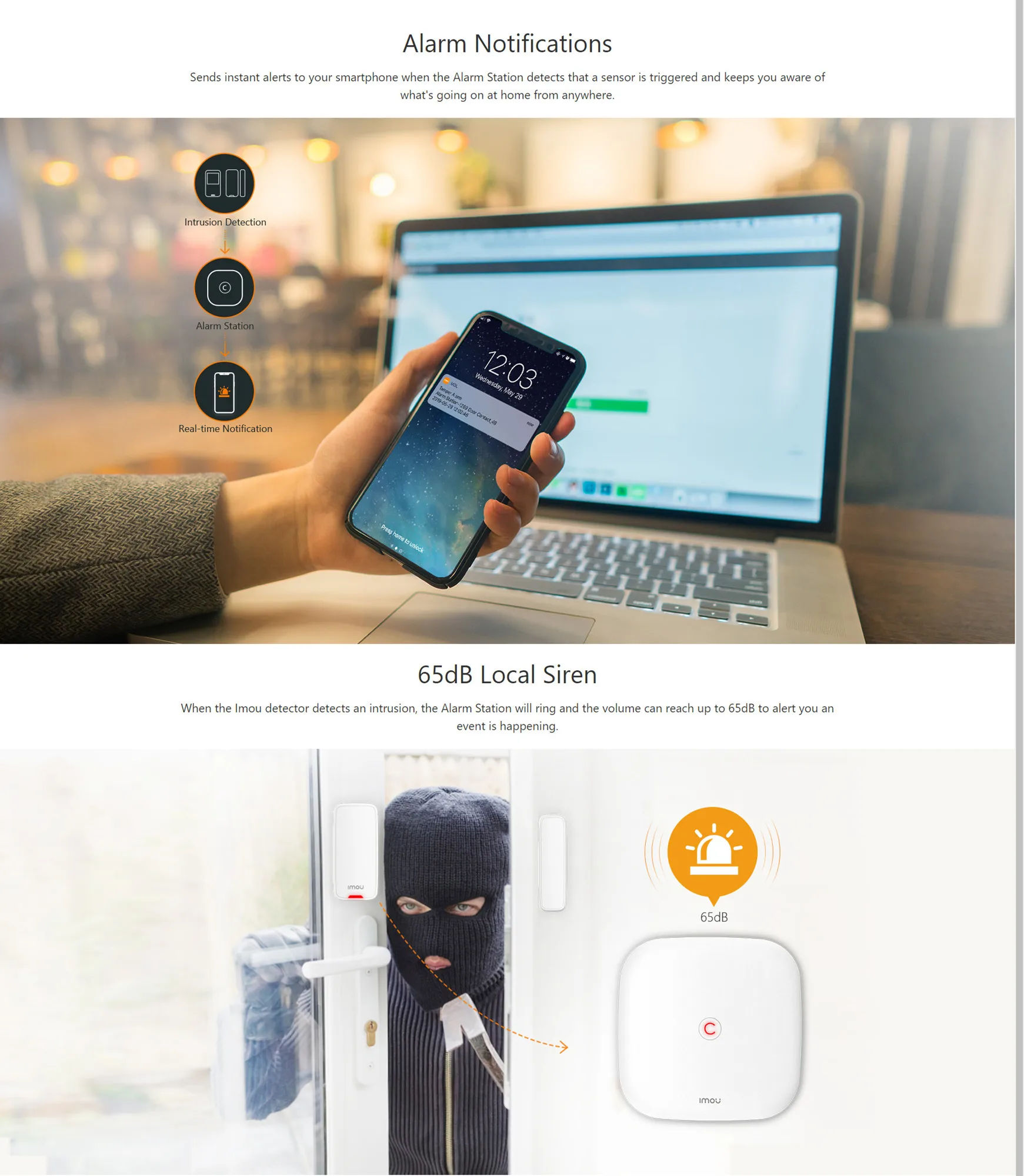 Когда детектор Imou обнаруживает вторжение, станция сигнализации зазвонит, и громкость может достигать 65 дБ, чтобы предупредить вас о происходящем событии.