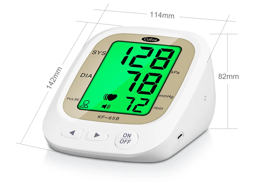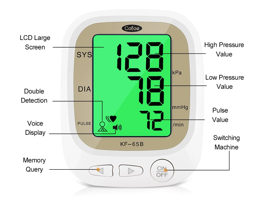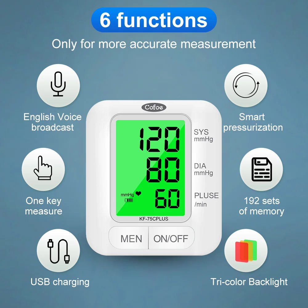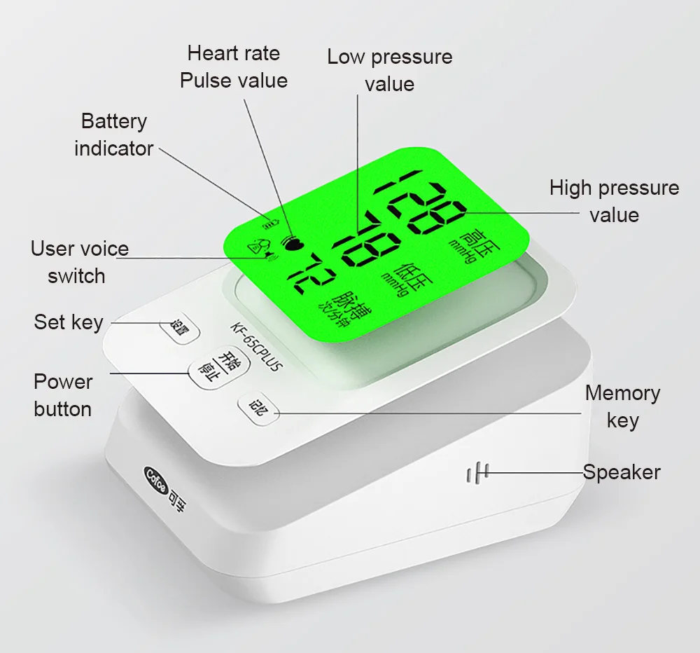 1. Двойная статистическая система, 1 набор равен 2 комплектам Переключение между пользователями AB, родители могут записывать данные вместе 2X192 Группы памяти и соотношение цена/качество 2. Трехцветная подсветка Высокое давление напоминание 3. Большой экран HD Легко увидеть 4. Интеллектуальная технология давления Автоматическая регулировка давления