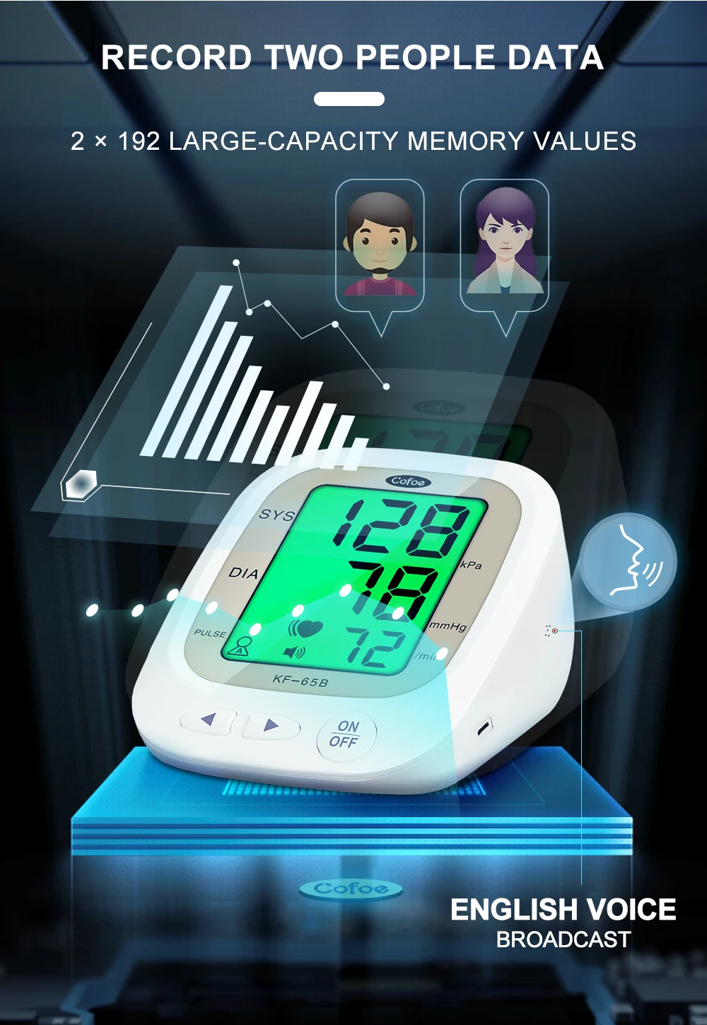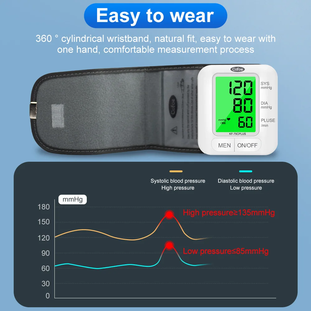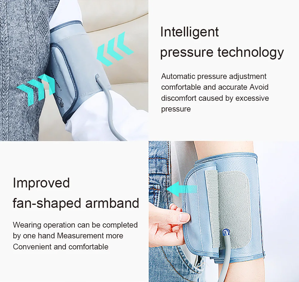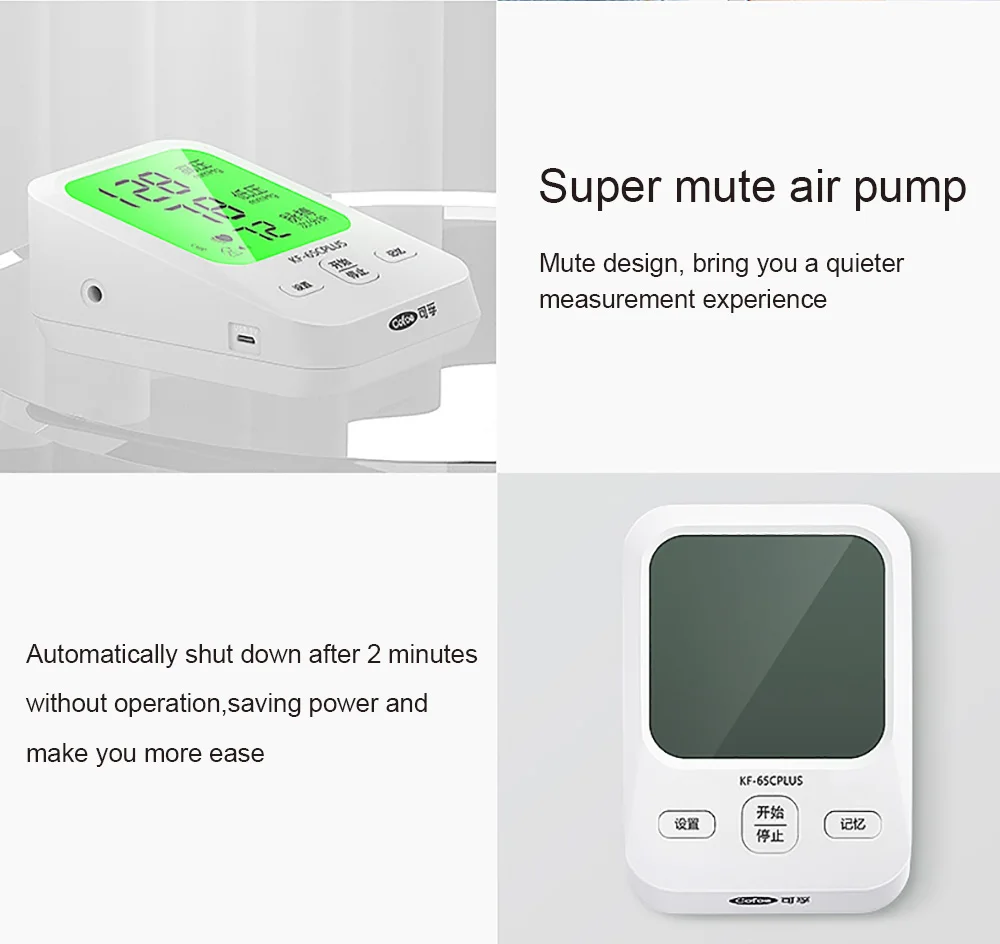 1. Двойная статистическая система, 1 набор равен 2 комплектам Переключение между пользователями AB, родители могут записывать данные вместе 2X192 Группы памяти и соотношение цена/качество 2. Трехцветная подсветка Высокое давление напоминание 3. Большой экран HD Легко увидеть 4. Интеллектуальная технология давления Автоматическая регулировка давления