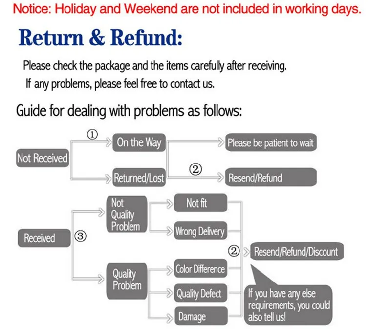 4. Если вы не удовлетворены полученным товаром, пожалуйста, сначала свяжитесь со мной, не важно, что это качество или размер, я постараюсь решить эту проблему, пожалуйста, не оставляйте сразу негативные отзывы, большое спасибо!
