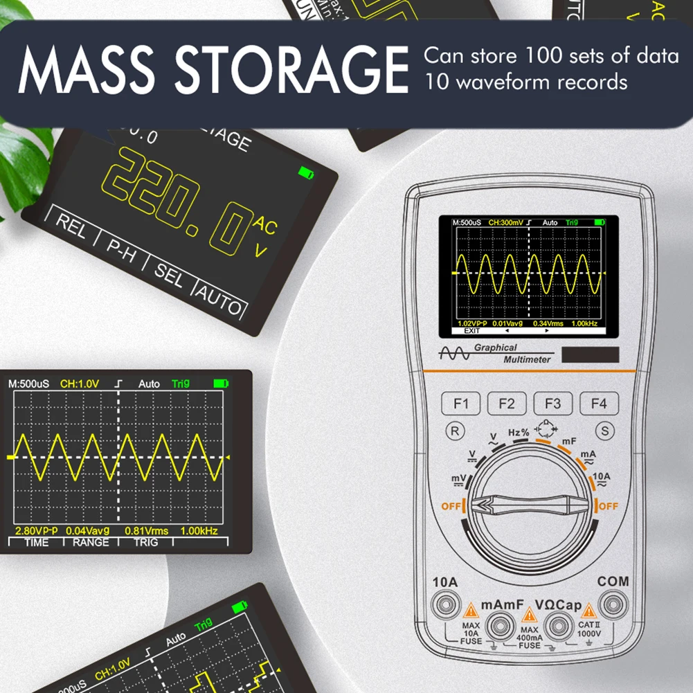 1. 2,5 Msps высокоскоростная выборка, аналоговая полоса пропускания 1 МГц (только ACV осциллограф), цифровой мультиметр 4000 кодов.