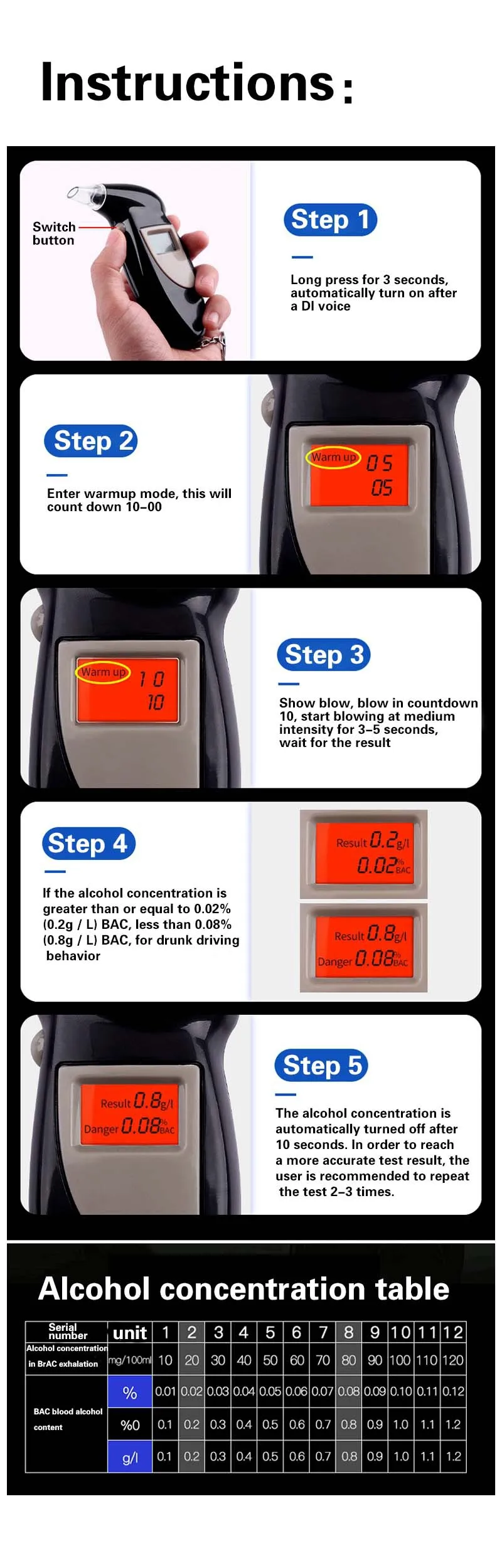 Alcohol tester detection range: 0.000%-0.199% BAC (0.00-1.99g / l)