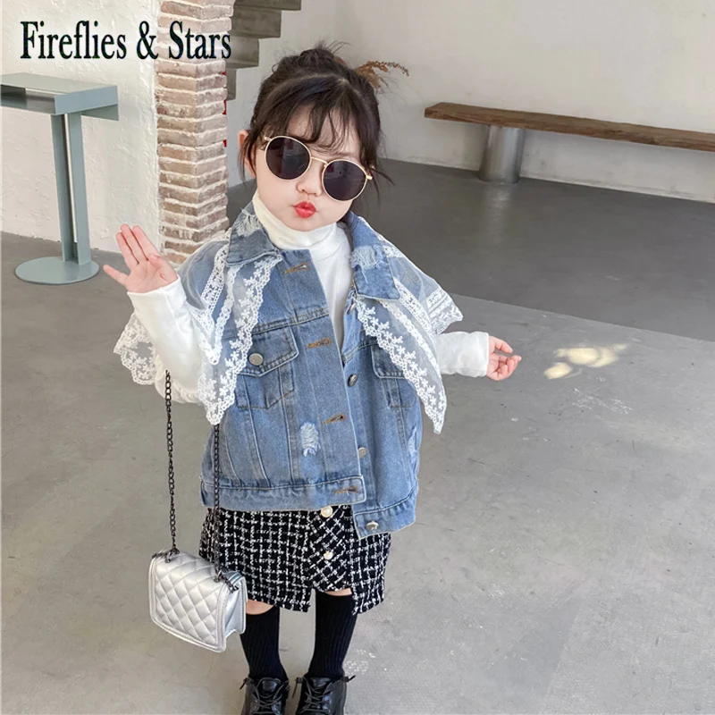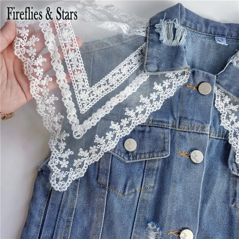 Название:Весенне-осенний джинсовый жилет для девочек куртка без рукавов для малышей Верхняя одежда для малышей, детская одежда новый кружевной сетчатый жилет с вышивкой и большим воротником для детей от 1 до 7 лет