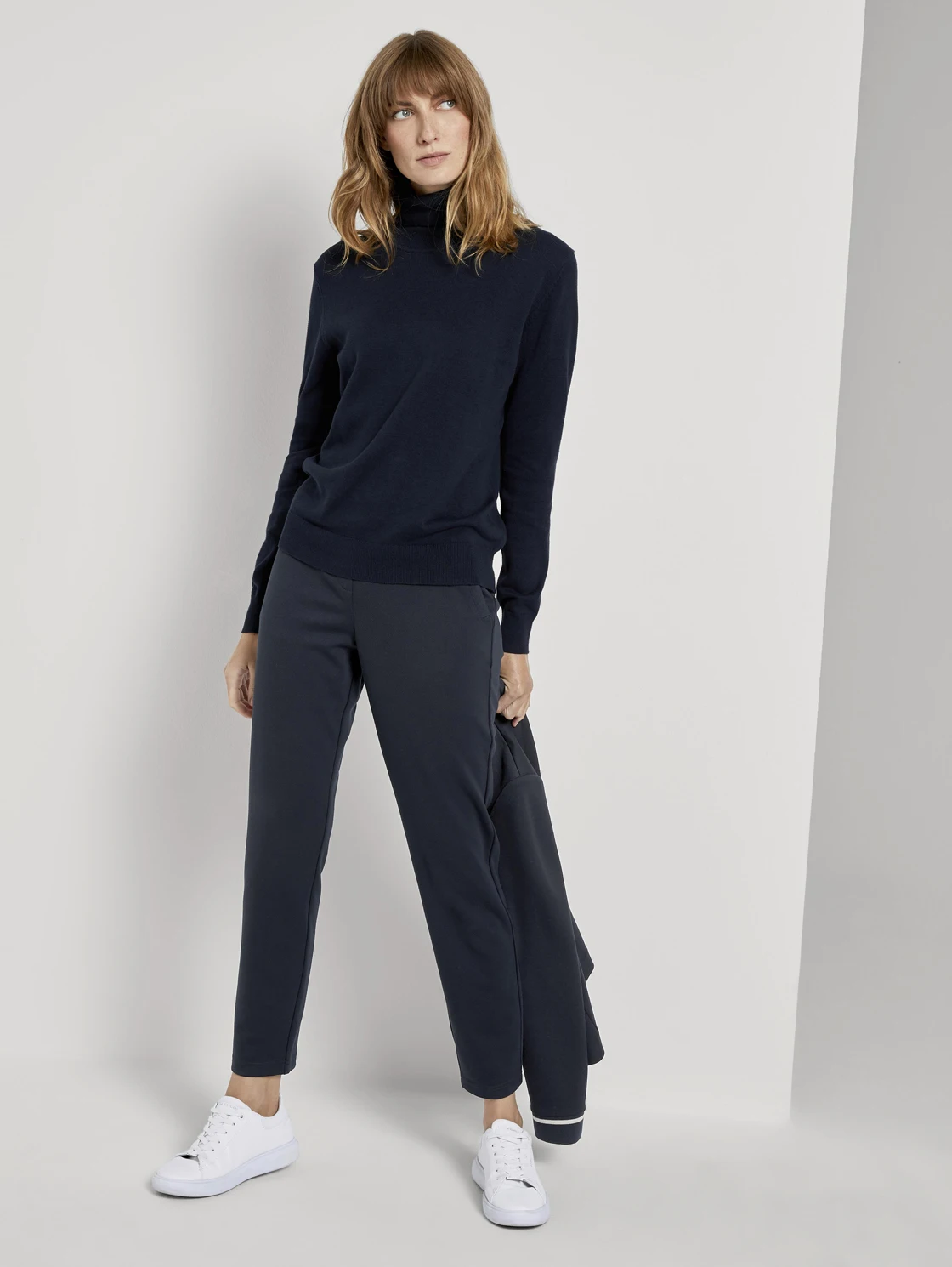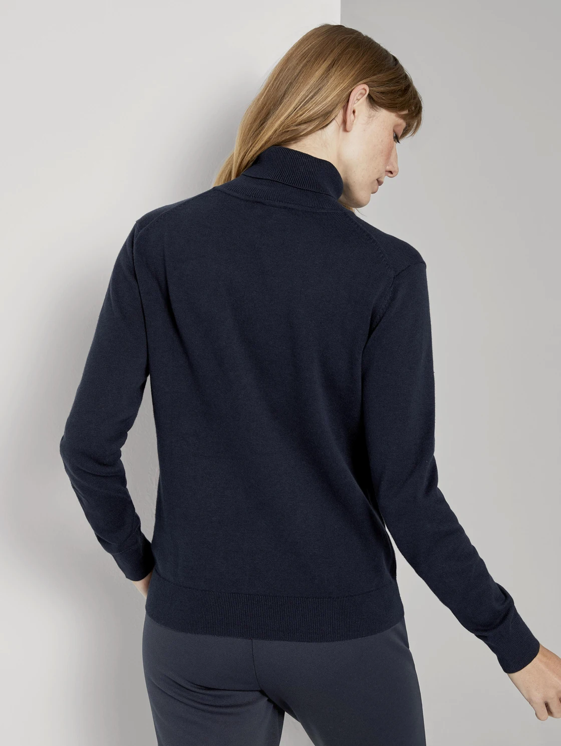 Pullover dark blue female Tom Tailor 60% cotton 40% viscose. An integral part of the autumn wardrobe is a turtleneck with a collar. A wide range of colors will create a unique image for every day.