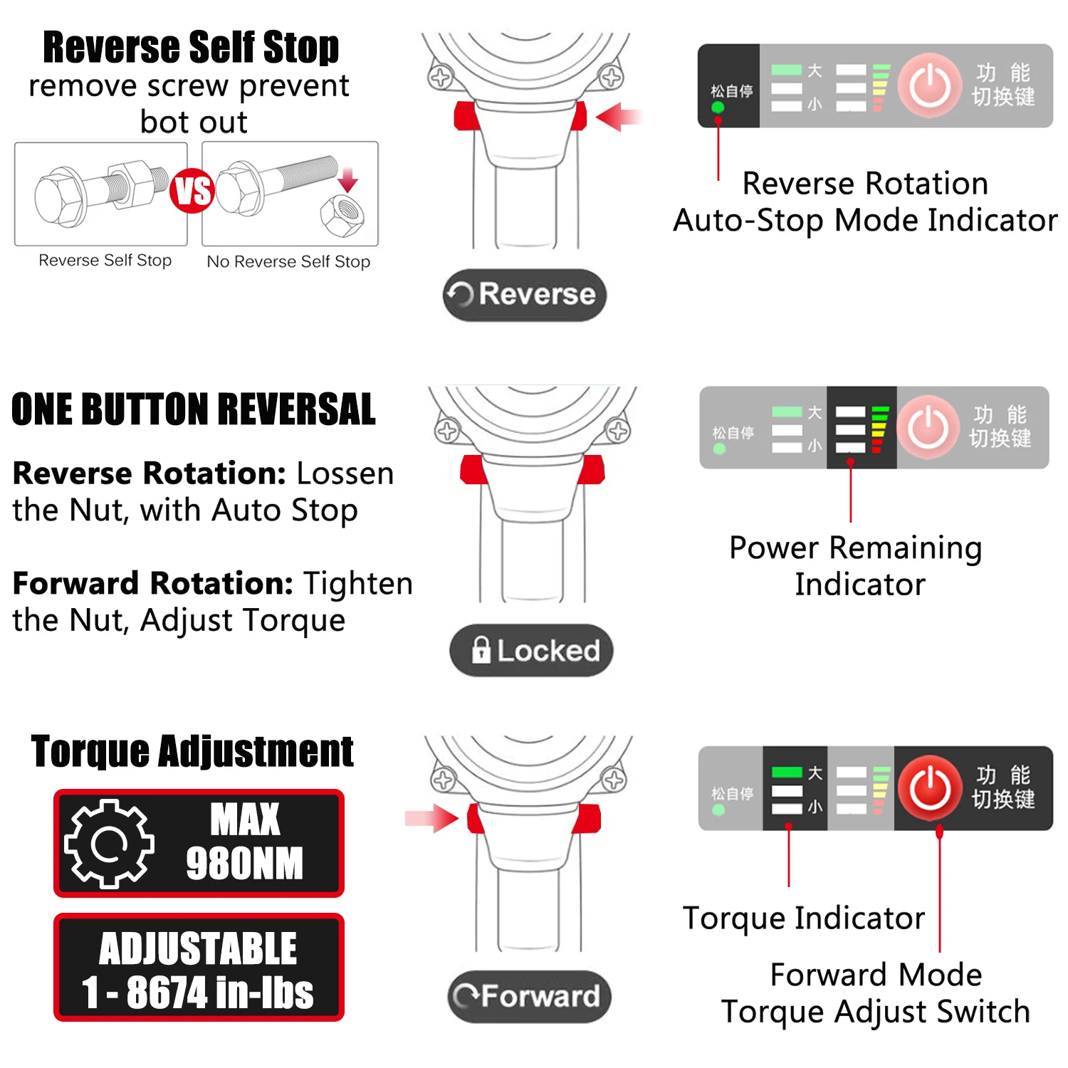 Мощный бесщеточный двигатель-высокопроизводительный бесщеточный двигатель обеспечивает крутящий момент до 980нм (8674 дюйма в фунтах) для легкого ослабления/затягивания любых ржавчины или более затянутых гаек, болтов или большого винта; он также может оптимизировать эффективность машины, увеличивает срок службы двигателя 10X и на 50% больше времени работы за заряд, не изнашивается и не искрится, меньше обслуживания, Легкий вес и более компактный размер.