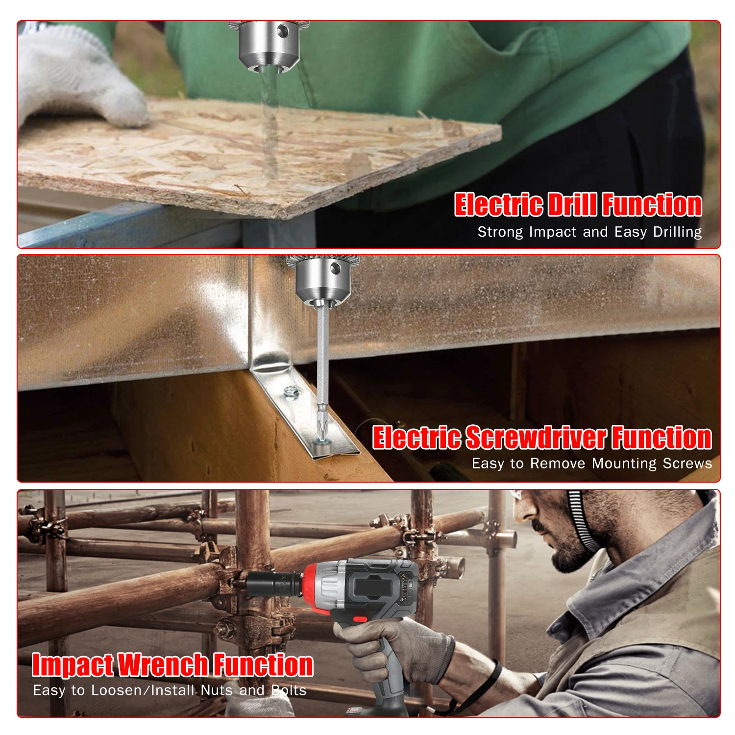 Универсальный електричюеского инструмента -- 1/2 дюймов и 1/4 дюйма быстрый патрон и ключ Тип 1,5-13 мм Ёмкость сверлильный патрон сочетает в себе черты электрическая отвертка, ударный гайковерт и ударная дрель. Один многофункциональный Аккумуляторный ударный драйвер может заменить комплект аккумуляторной дрели, для ослабления/затягивания любой гайки, болта или большого винта, а также для сверления. Хорошо подходит для ремонта дома, строительных проектов, промышленного оборудования или ремонта запасных частей и ремонта мотоциклов.