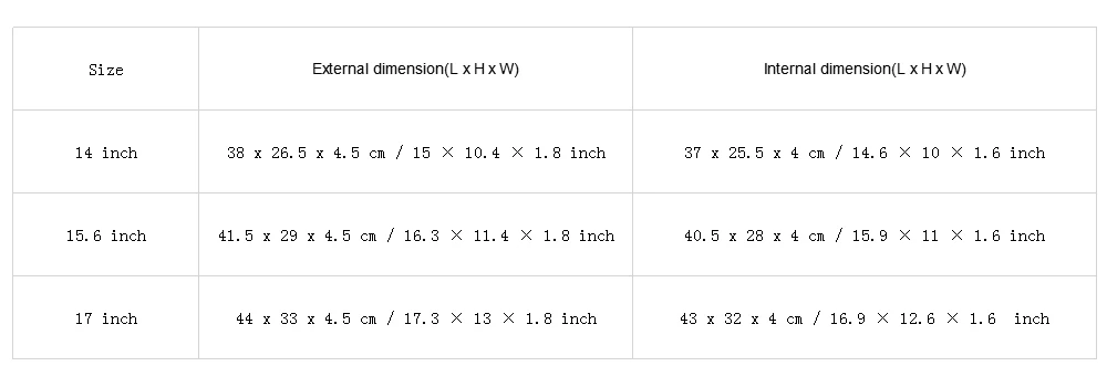 ①. Основной карман может держать одежду, ноутбук, бутылку, зарядное устройство, внешний аккумулятор, ноутбук или планшет и т. Д. Рукава для ноутбука разных размеров поддерживают laotop и планшет разных размеров. Должен быть один размер, подходящий для вашей машины! Пожалуйста, внимательно выбирайте рукав, если у вас есть какие-либо проблемы, вы можете связаться с нами, мы постараемся сделать все возможное, чтобы служить вам! ②. Передний боковой карман: обеспечивает дополнительное пространство для хранения небольших предметов, таких как адаптеры питания, кабели, ручки и блокноты, что обеспечивает дополнительное удобство.