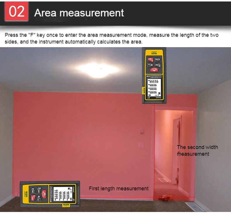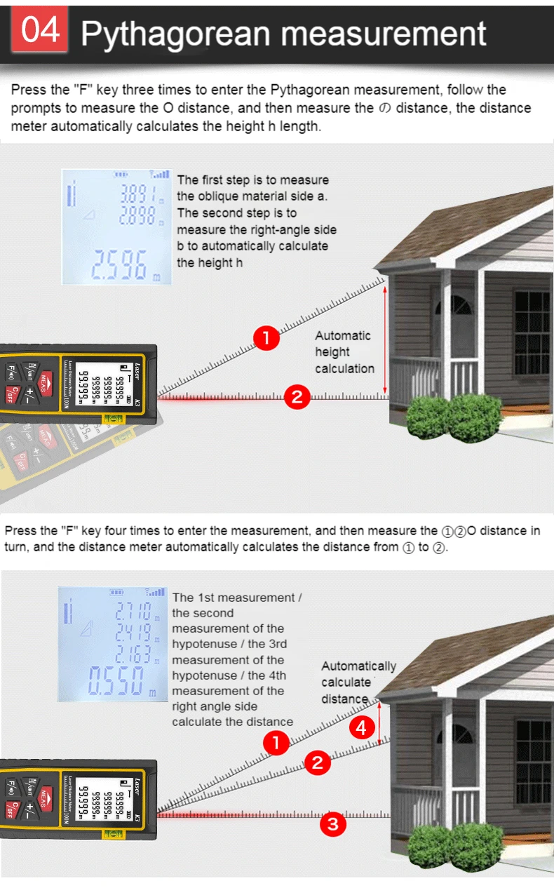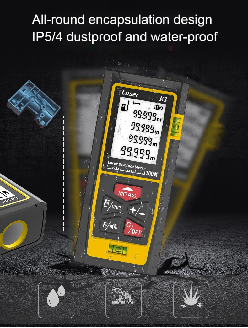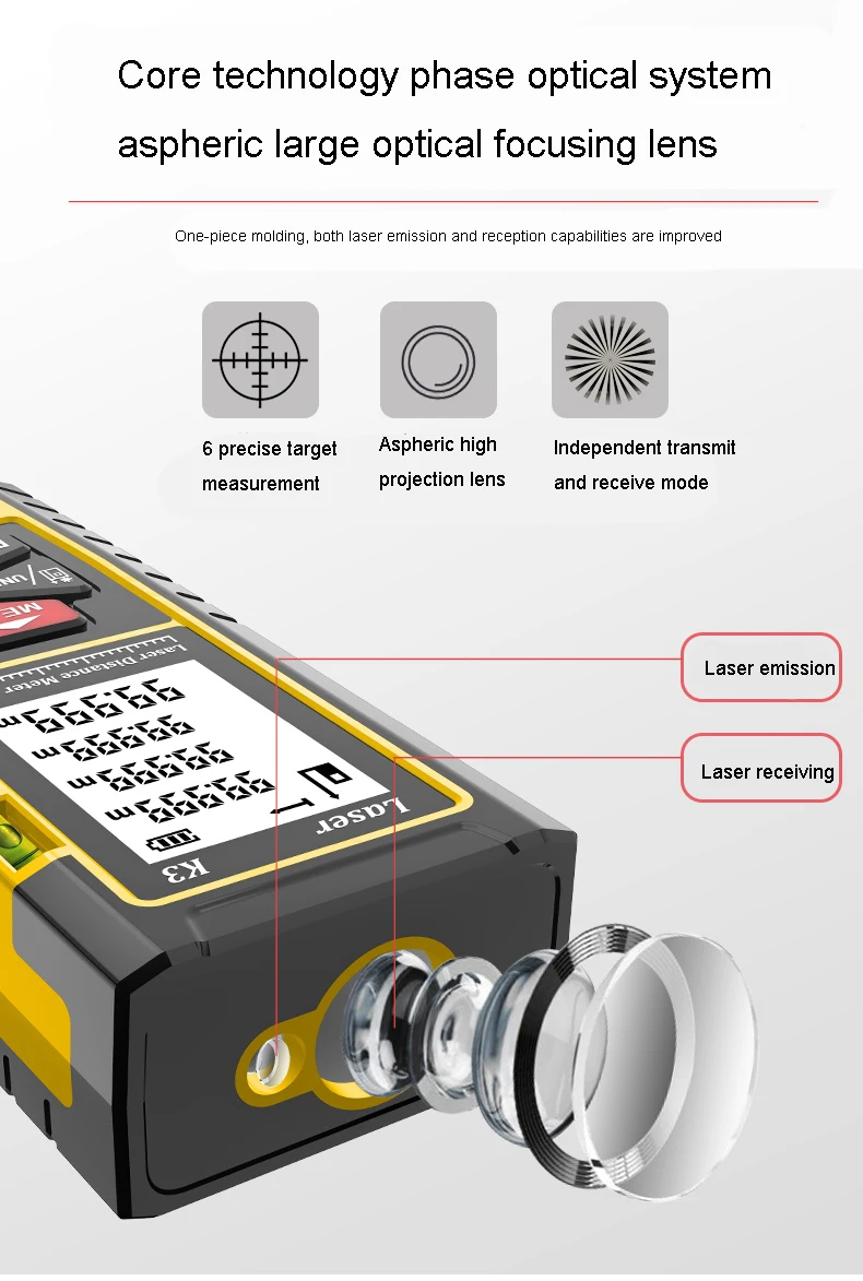 1,3 единицы измерения могут быть переключены по желанию 2,20 наборов данных можно хранить в любое время для просмотра и сравнения 3. Обновление оптических линз, оптические линзы увеличивают восприятие светильник и делают измерения более быстрыми и стабильными. 4. Установите передний/задний ориентир. 5. Большой ЖК-дисплей с подсветкой. 6. Степень защиты IP54, водонепроницаемый, пыленепроницаемый, ударопрочный, исключительная устойчивость к царапинам, падениям и ударам.
