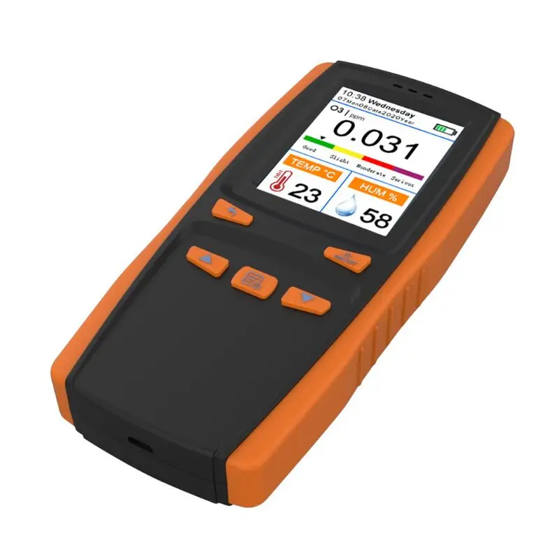 2,8 "цветной жидкокристаллический дисплей (ЖК-дисплей), 320x240 пикселей Пользовательский Регулируемый Порог тревоги для O3, чтобы оповещать пользователя о переменных, температурах, тестовых переменных повышенных уровней, влажность большой емкости 2000mAh литиевая батарея бортовой вентилятор для рисования в окружающем воздухе для более точных результатов в реальном времени 5V микро USB зарядка низкого заряда батареи предупреждение.