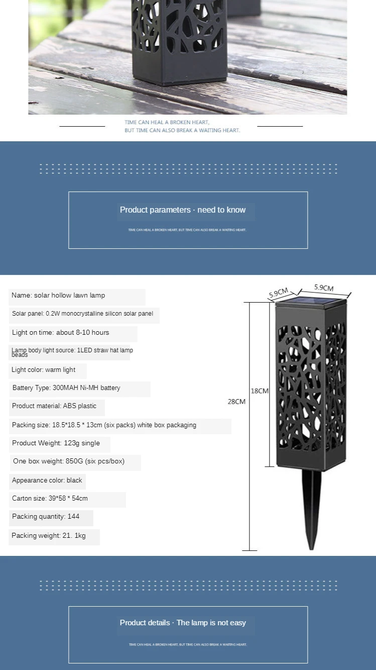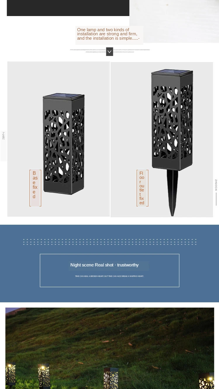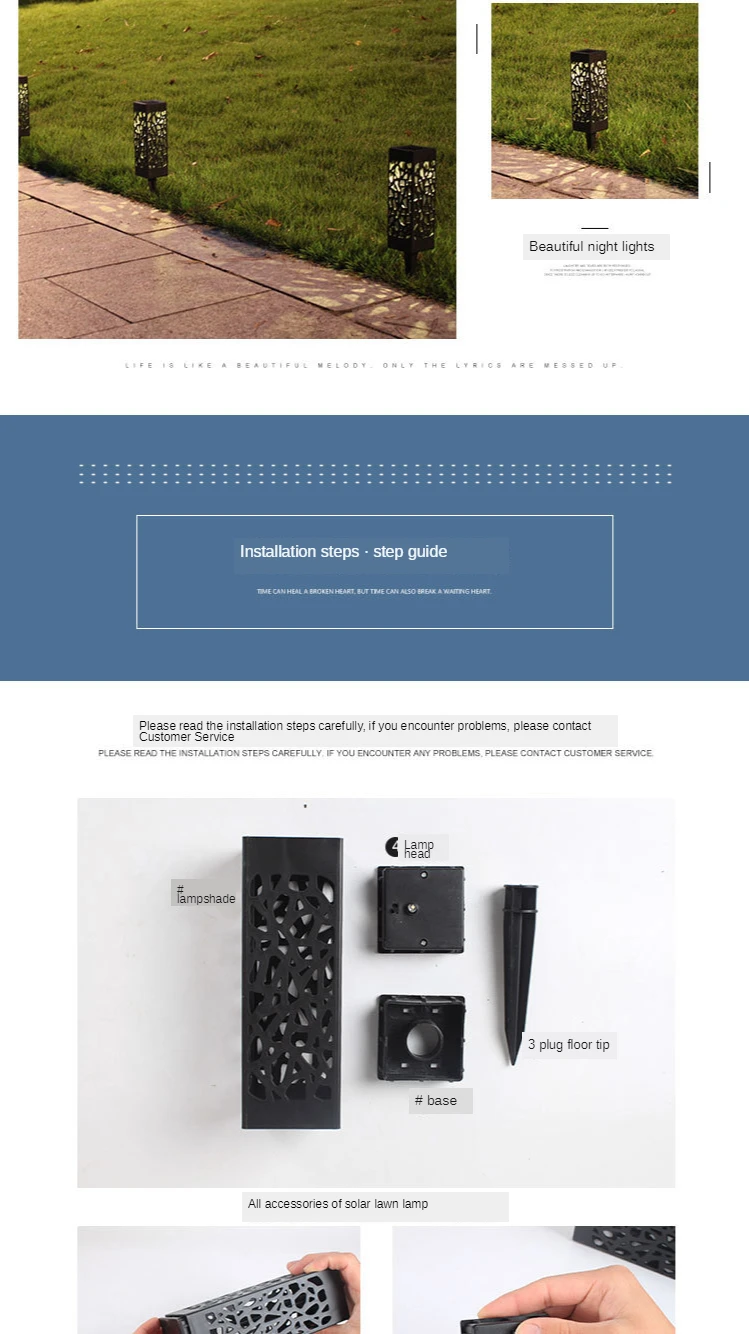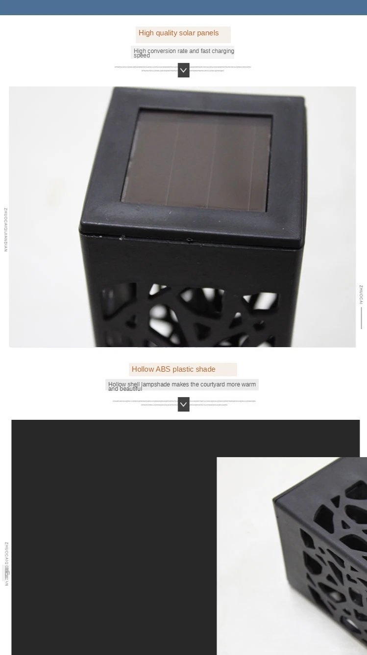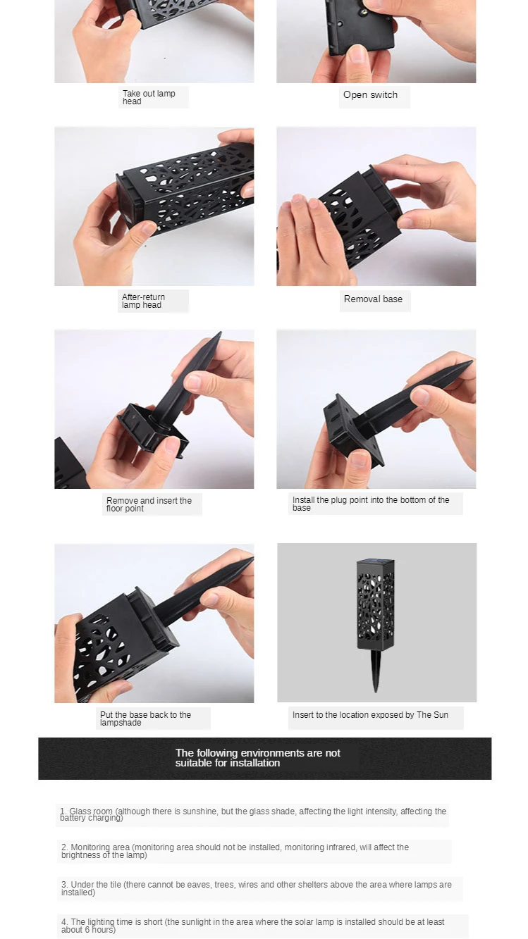 4. Простота установки: никаких инструментов или проводов не требуется. Выньте кол из корпуса и установите его в нижнюю часть корпуса КОРПУСА корпуса и включите переключатель под панелью солнечных батарей, затем вставьте светильник в мягкую землю. Переключатель просто должен включаться в первый раз, светильник автоматически включается ночью и выключается на рассвете