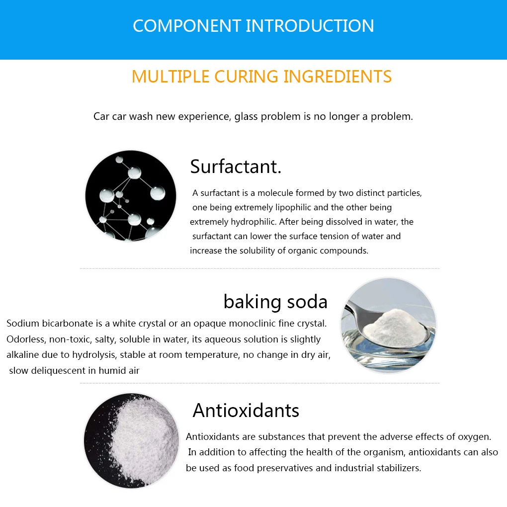 Описание: В дополнение к пыли, автомобильному стеклу, в дополнение к пыли, включает в себя насекомых, шлама, асфальт, соленый, палочки для деревьев, отпечатки пальцев, сажу, пластиковые испарители и так далее. Этот продукт является высокопроизводительным чистящим средством. Он непосредственно смешивается с чистой водой и добавляется в чайник стеклоочистителя. Он очень удобен в использовании и может легко удалить стеклянную масляную пленку и следы насекомых. Этот продукт оказывает смазывающее действие на резиновую кожу стеклоочистителя и обладает антивозрастной функцией для поддержания гибкости и продления срока службы. Этот продукт подходит для ежедневной уборки и ухода за всеми видами импортных и домашних автомобилей высокого класса. Маленький размер, удобно носить с собой. Производительность эффективная, зерно 4 литра равно общей воды стеклоочистителя. Основные ингредиенты: бикарбонат натрия, лимонная кислота, ПАВ, дезактивация активных ферментов, полимерные смазки. Функция: Очистите и обеззараживайте, уменьшите трение между стеклоочистителем и стеклом и Защитите его.