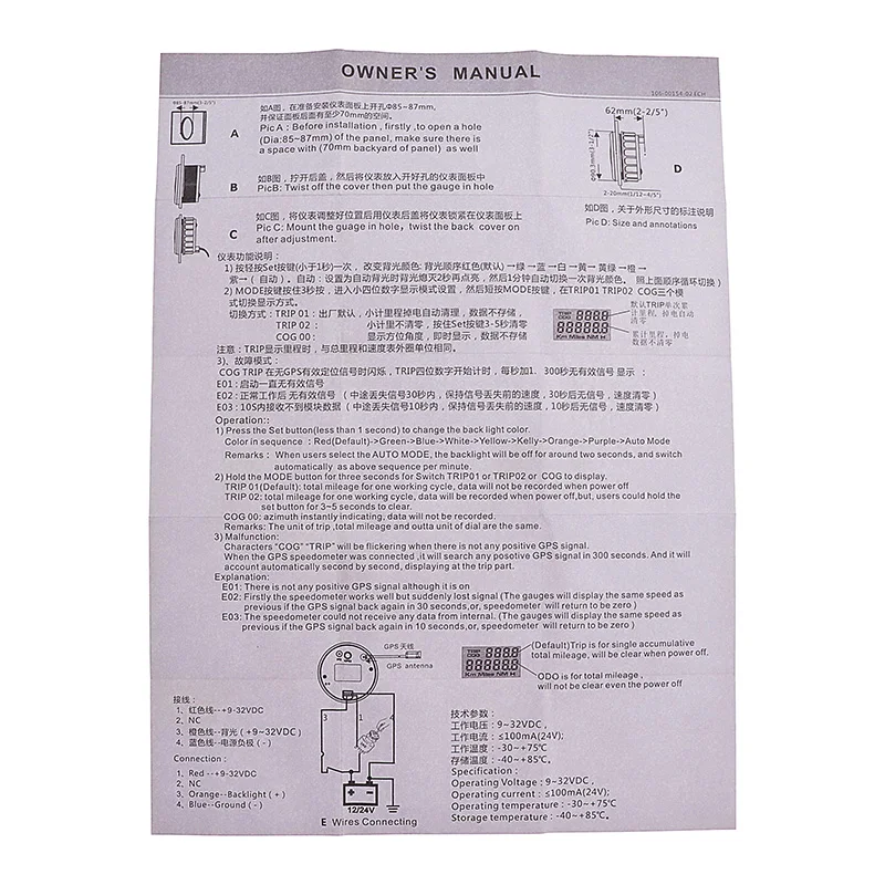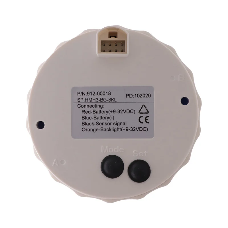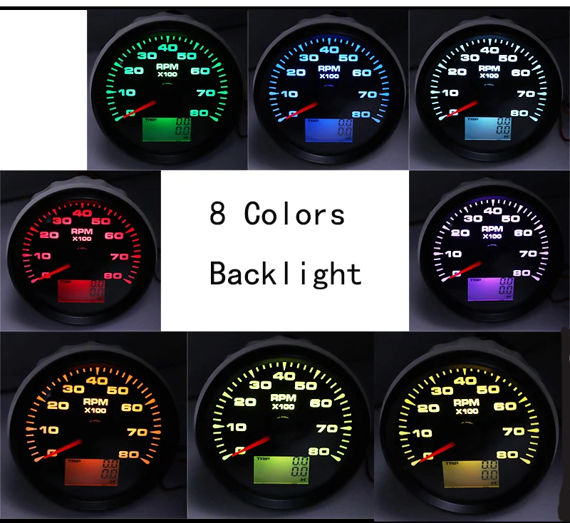 Фиксирующий Размер: 85 мм Тахометр Подходит для: универсальных автомобилей, грузовиков, лодок Материал: нержавеющая сталь 316L + противотуманное стекло Коэффициент скорости: 1 ~ 800 регулируемый Рабочее напряжение: 9 ~ 32 В 7 цветов подсветки: красный, желтый, оранжевый, зеленый, синий, фиолетовый, белый, Вы можете выбрать подсветку, нажав на заднюю кнопку датчика