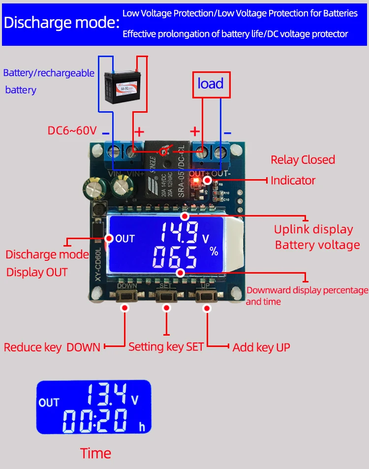 Установив верхний предел напряжения вверх и нижний предел напряжения dn; Когда напряжение батареи больше или равно верхнему пределу напряжения вверх, реле включается и начинает разрядку; когда напряжение батареи меньше или равно низкому предельному напряжению dn, Реле выключается и завершает функцию автоматической разрядки; Когда реле включается, выход мигает, указывая, что он разрядится.