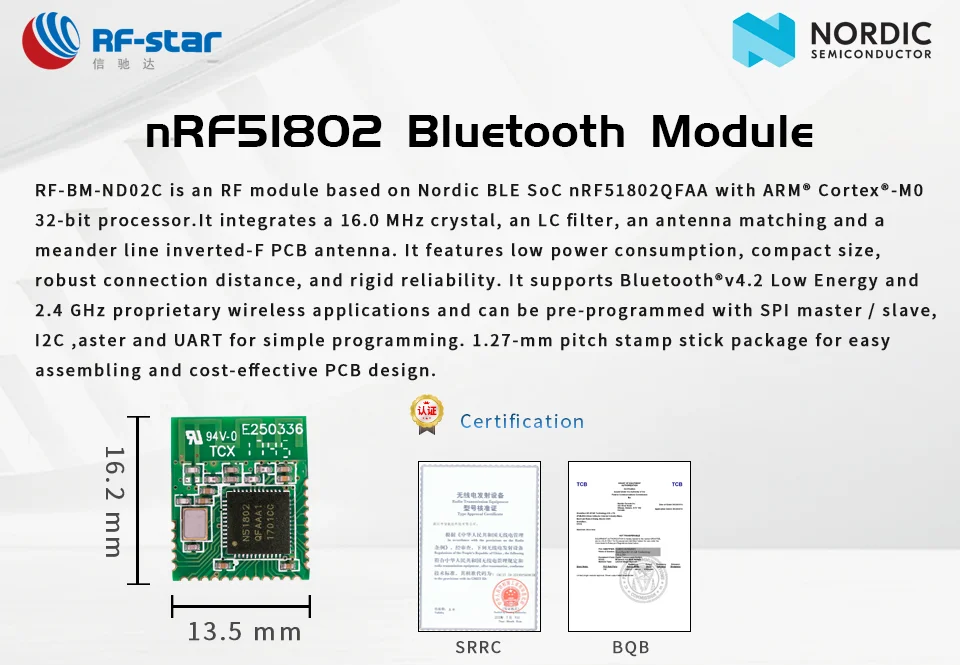RF-BM-ND02C is an RF module based on Nordic BLE SoC nRF51802QFAA with ARM® Cortex®-M0 32-bit processor. It integrates a 16.0 MHz crystal, an LC filter, an antenna matching and a meander line inverted-F PCB antenna. It features low power consumption, compact size, robust connection distance, and rigid reliability. It supports Bluetooth® v4.2 Low Energy and 2.4 GHz proprietary wireless applications and can be pre-programmed with SPI master / slave, I2C ,aster and UART for simple programming. 1.27-mm pitch stamp stick package for easy assembling and cost-effective PCB design. RF-BM-ND02C is pin-to-pin compatible with RF-BM-ND02.