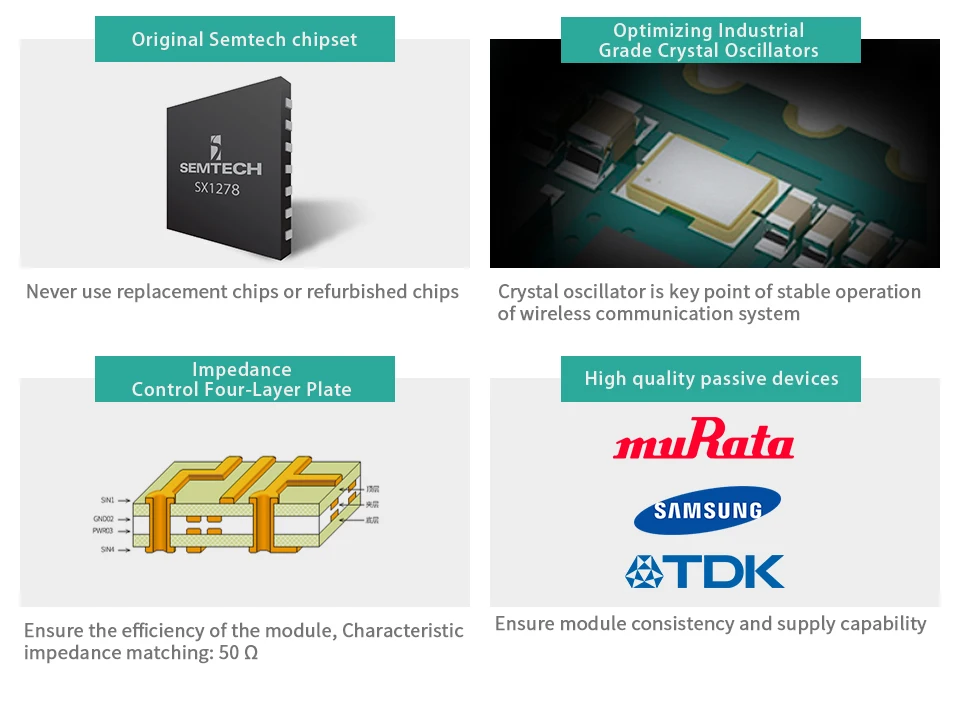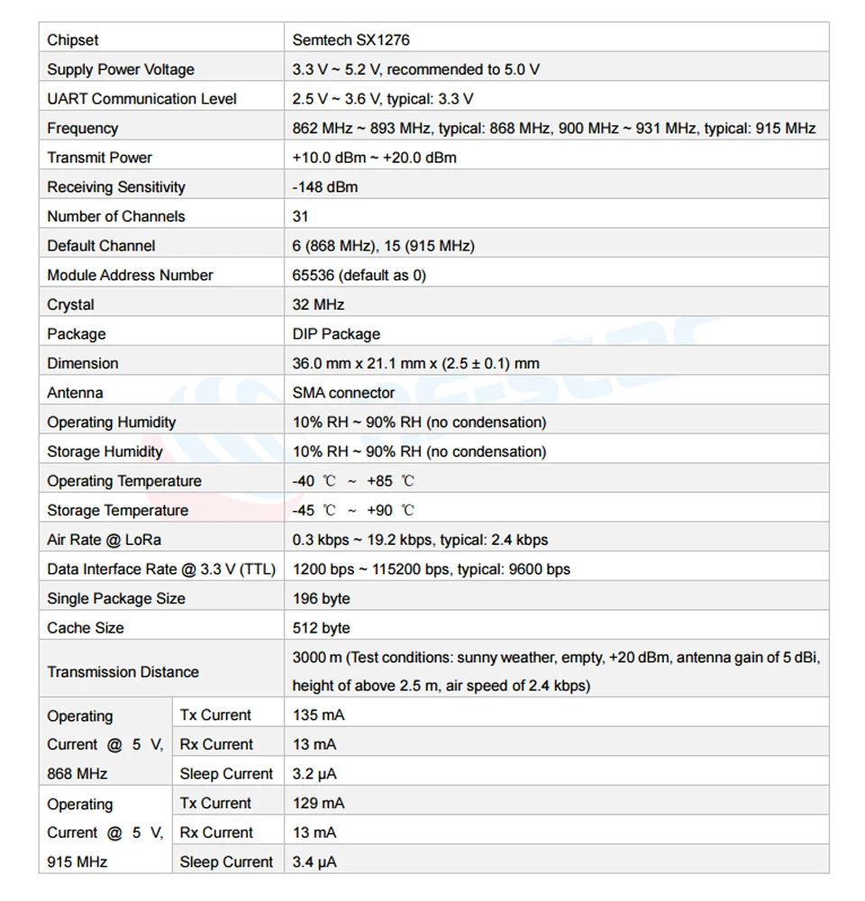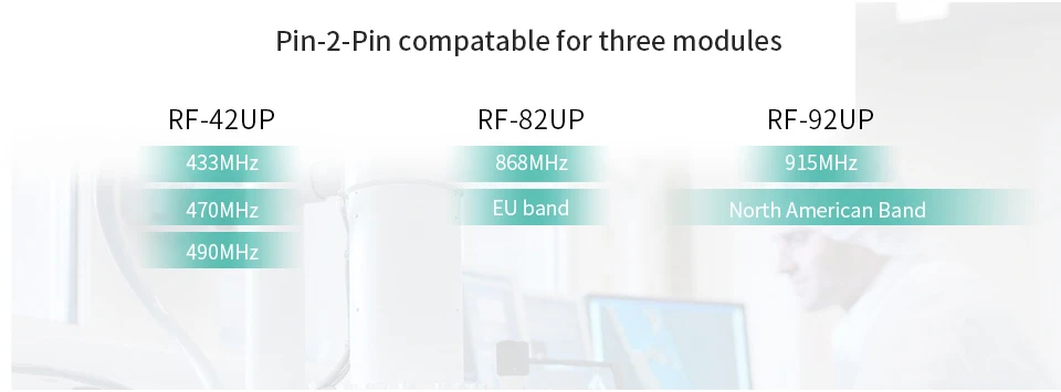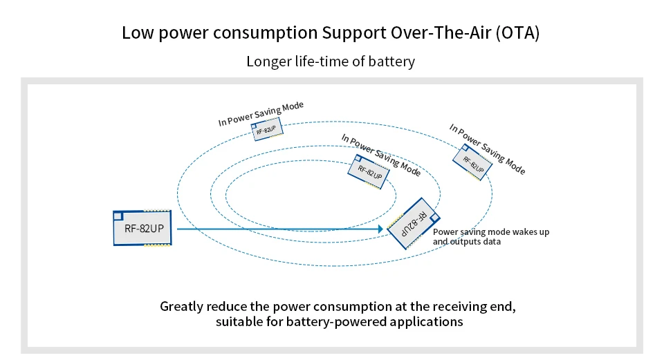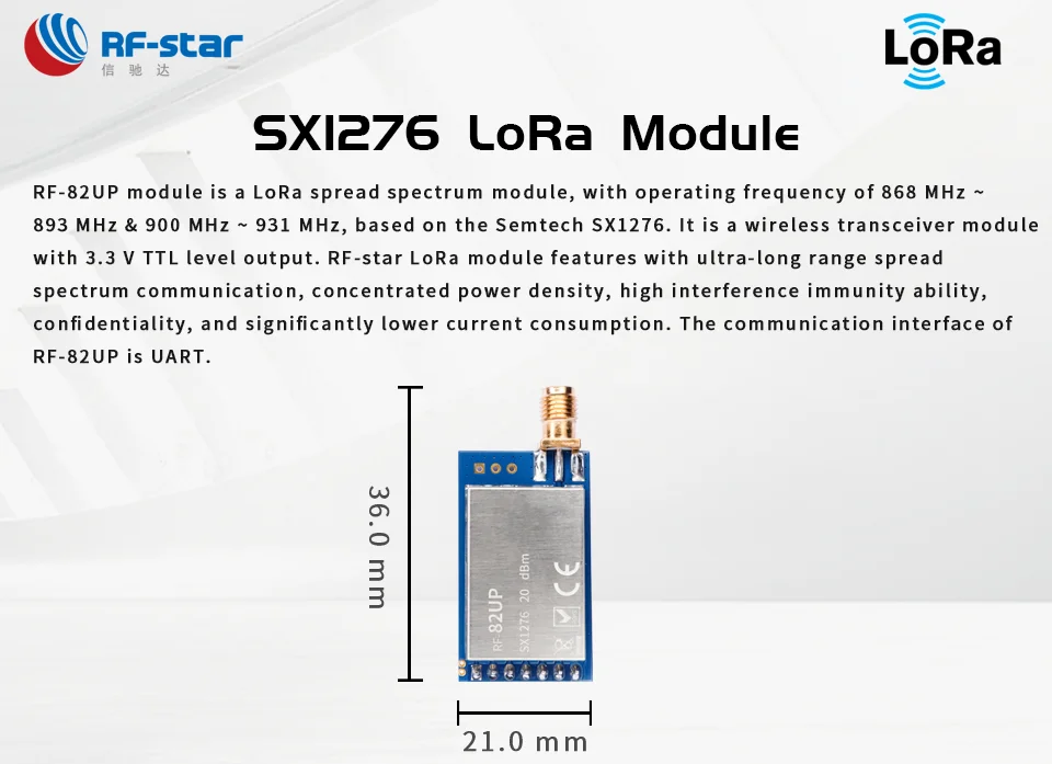 Модуль RF-82UP-это модуль LoRa spread spectrum с рабочей частотой 868 МГц ~ 893 МГц и 900 МГц ~ 931 МГц на основе Semtech SX1276. Это беспроводной модуль приемопередатчика с 3,3 V TTL Уровень выходного сигнала. РЧ-звездный LoRa модуль оснащен сверхдальней передачей спектра, концентрированной плотностью мощности, высокой способностью помех, конфиденциальностью и значительно меньшим потреблением тока. Интерфейс связи RF-82UP UART.
