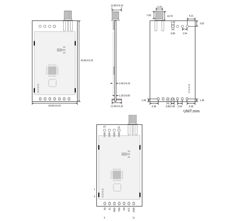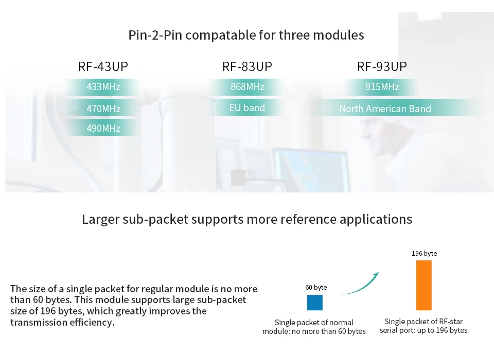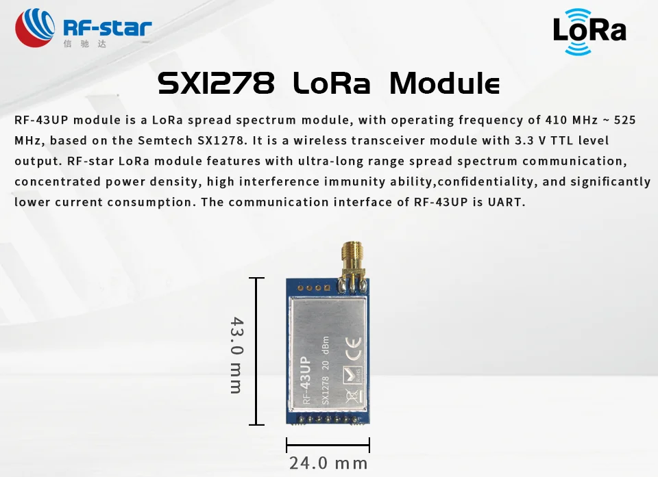 RF-43UP модуль представляет собой модуль LoRa spread spectrum с рабочей частотой 410 МГц ~ 525 МГц на основе Semtech SX1278. Это беспроводной модуль приемопередатчика с 3,3 V TTL Уровень выходного сигнала. РЧ-звездный LoRa модуль оснащен сверхдальней передачей спектра, концентрированной плотностью мощности, высокой способностью помех, конфиденциальностью и значительно меньшим потреблением тока. Интерфейс связи RF-43UP UART.