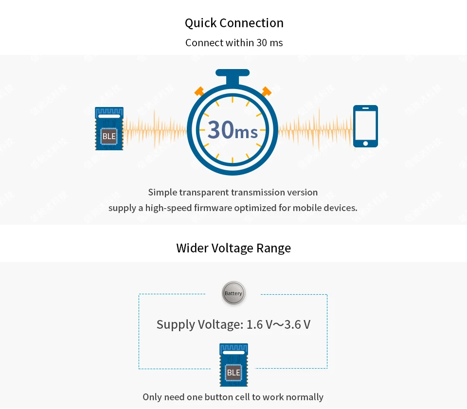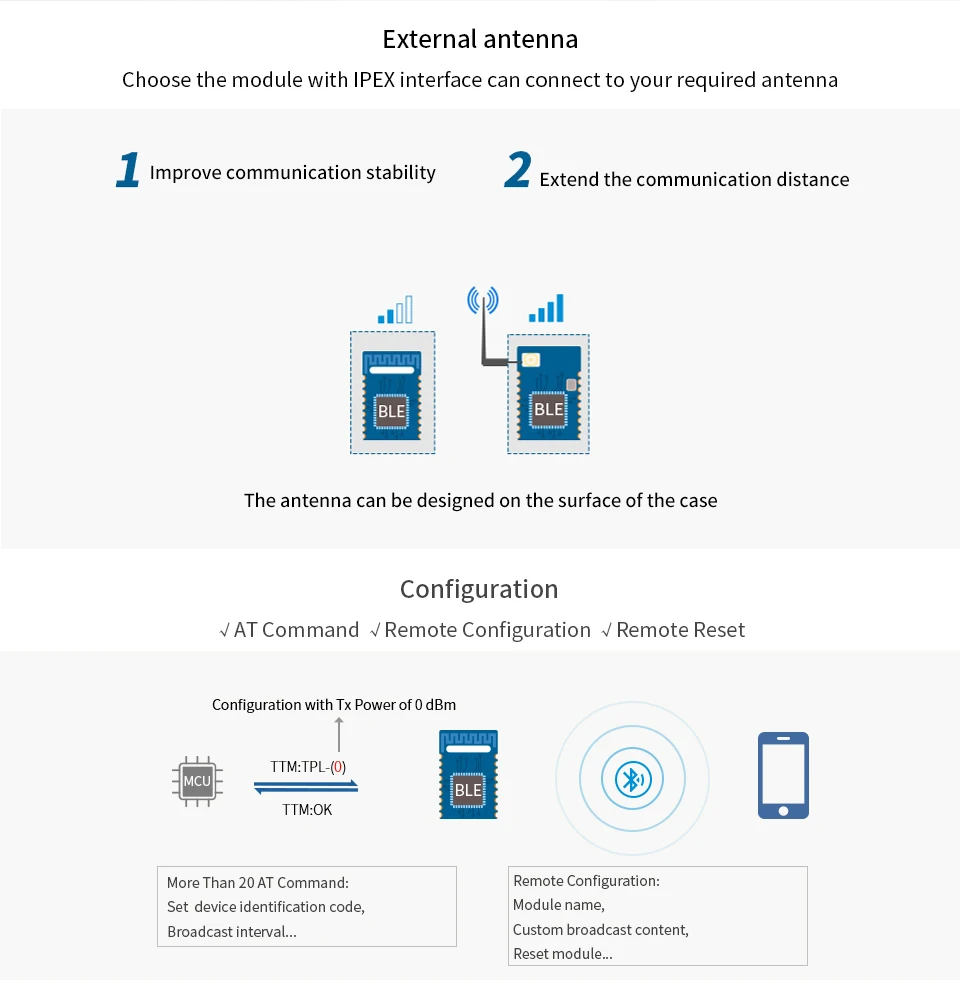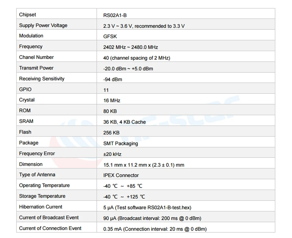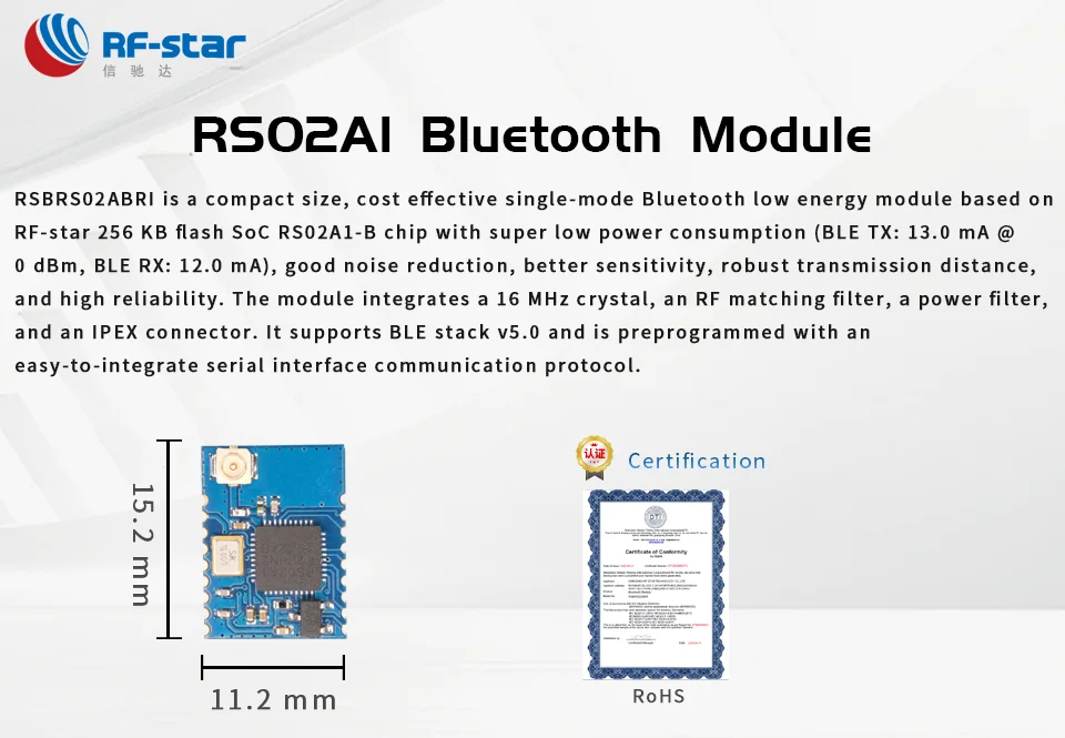 RSBRS02ABRI-это компактный размер, экономичный однорежимный модуль Bluetooth с низким энергопотреблением на основе радиочастотной звезды 256 КБ флэш-накопитель SoC RS02A1-B чип с супер низким энергопотреблением (BLE TX: 13,0 мА @ 0 дБм, BLE RX: 12,0 мА), хорошее шумоподавление, Лучшая чувствительность, Надежное расстояние передачи и высокая надежность. Модуль интегрирует кристалл 16 МГц, фильтр соответствия RF, фильтр питания и разъем IPEX. Он поддерживает BLE stack v5.0 и предварительно запрограммирован с помощью простого в интеграции последовательного интерфейса протокола связи.