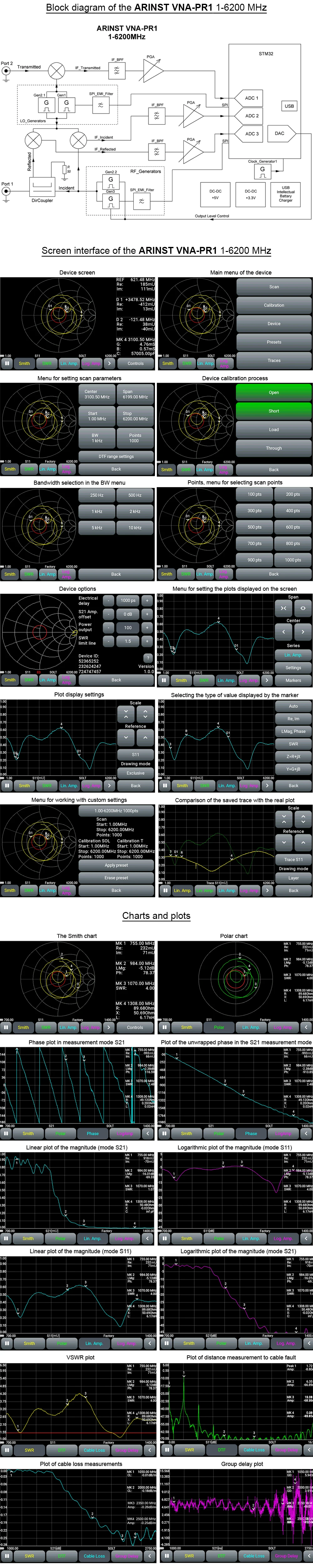 Отображенные диаграммы:Диаграмма Смита; Полярная диаграмма; Фаза коэффициента отражения S11 и коэффициент передачи S21; Величина S11 и S21; Логарифмическая величина S11 и S21; SWR; Расстояние до отказа; Потеря кабеля, групповая задержка.