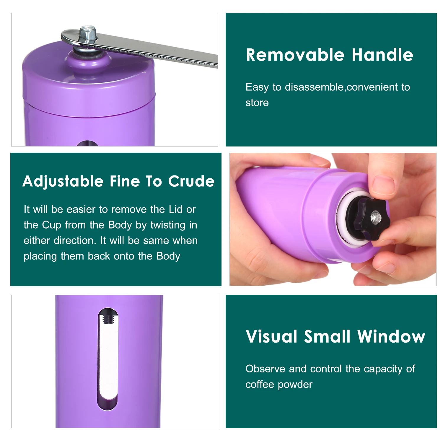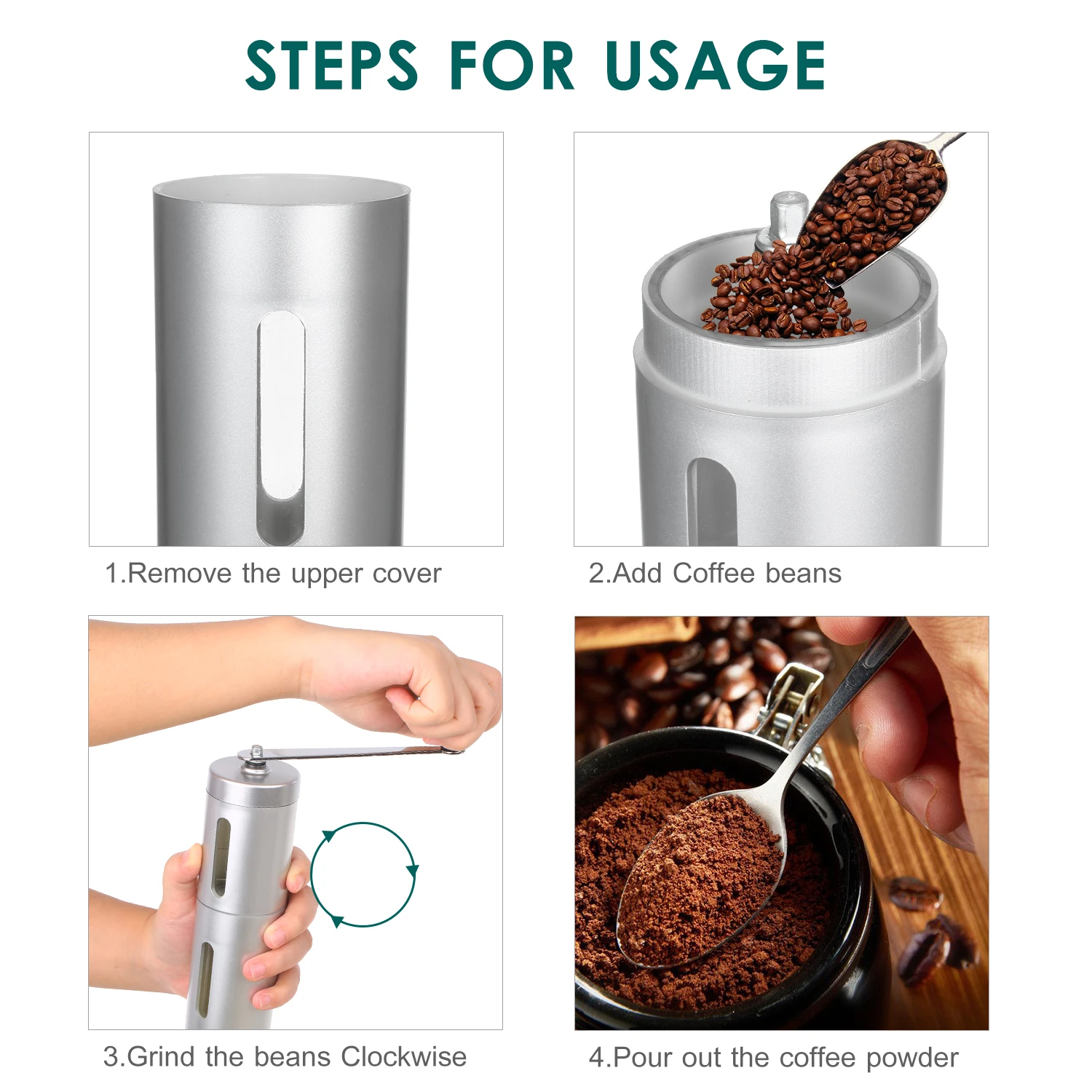 Портативный и легко чистится-компактный размер легко хранить и носить с собой, и не занимает места. Ручная кофемолка может быть очищена щеткой или водой, легко перемещается и разбирается для очистки.