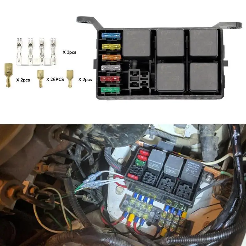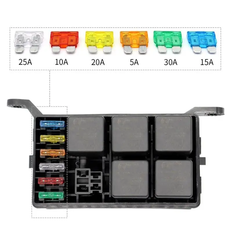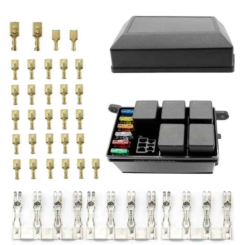 1. 6-way предохранитель + 6-реле держатель коробка с стержни лопаты и 6 шт. предохранитель, 5 шт. 5Pin 12V 40A реле и 1 шт. 4 pin реле.