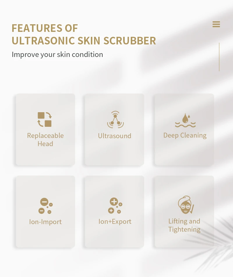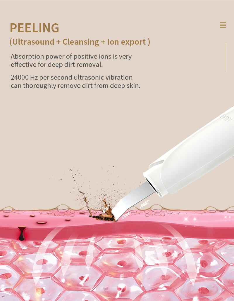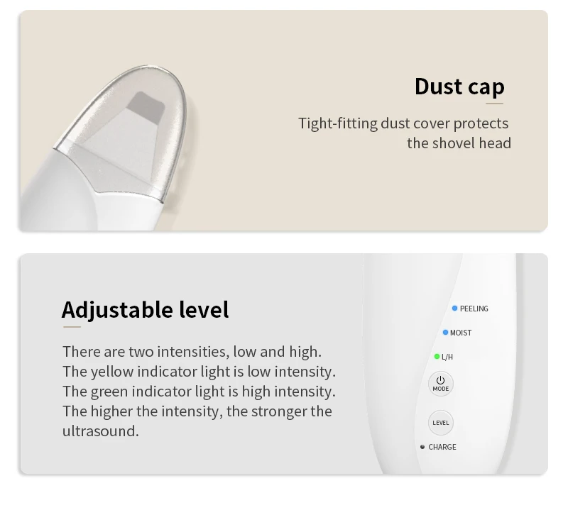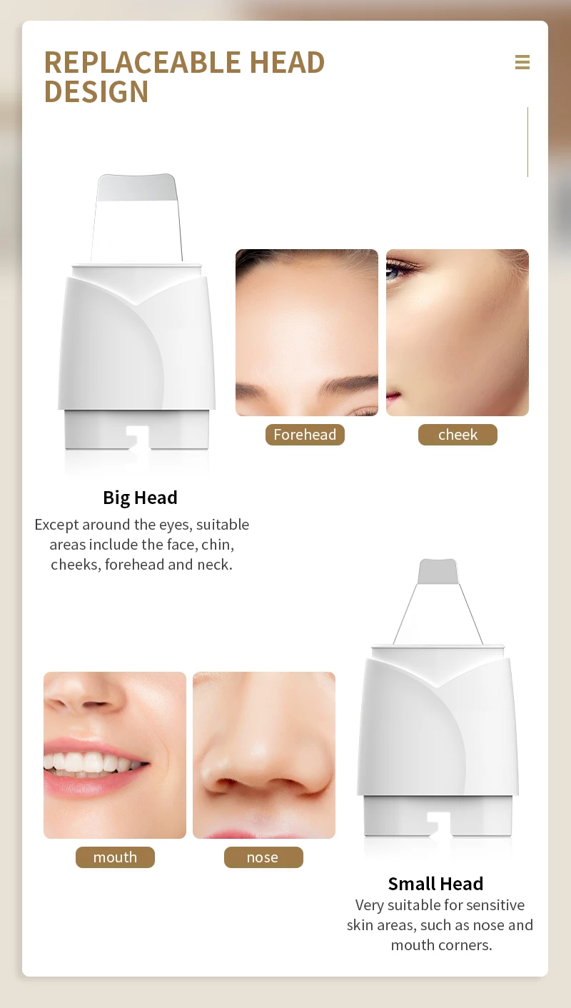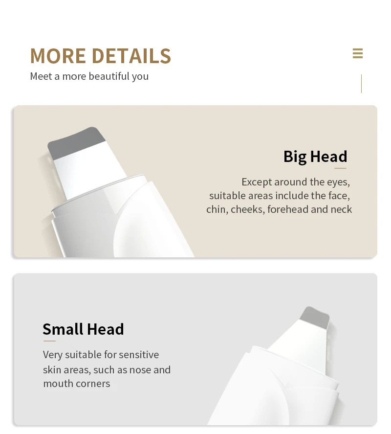 1. Конструкция сменной головки: Большая голова: за исключением глаз, Подходящие области включают лицо, подбородок, щеки, лоб и шею. Маленькая головка: очень подходит для чувствительной кожи, например, для углов носа и рта. 2. Чистый режим, ультразвуковой + ионный экспорт может легко очистить грязь и черные точки под кожей. 3. Увлажняющий режим, ультразвуковой + красота введение + ионтофорез может эффективно поглощать продукты по уходу за кожей и держать кожу увлажненной.