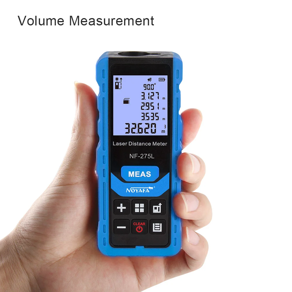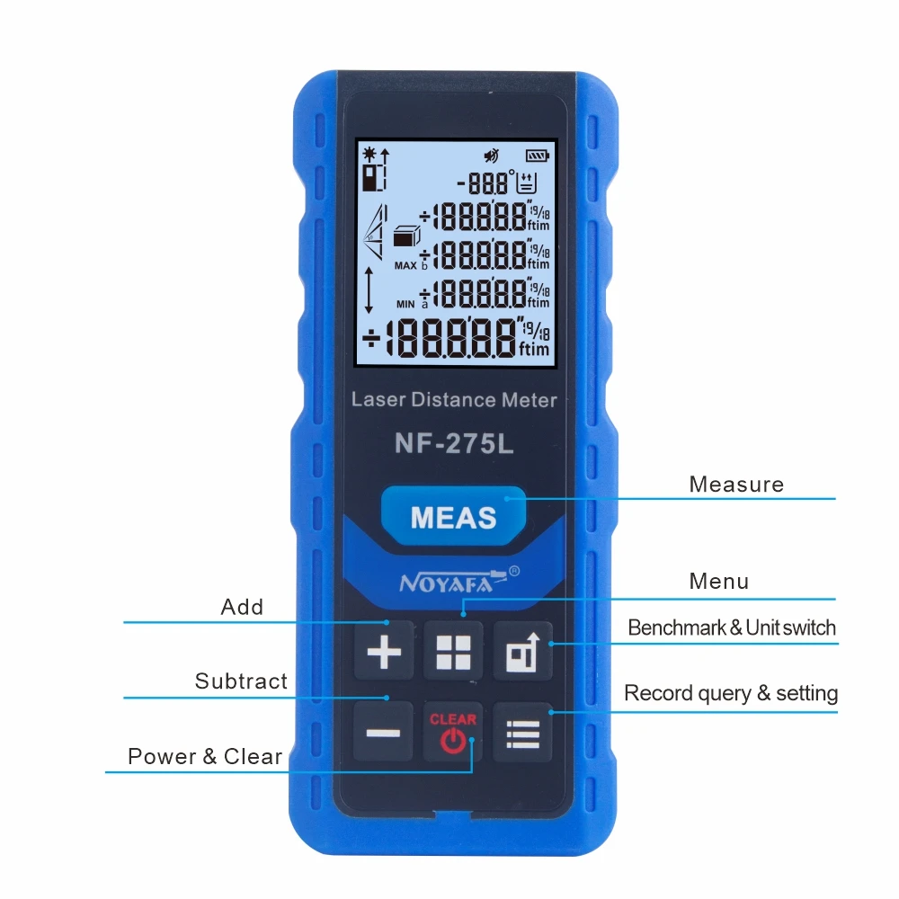 NF-275L: 60-метровый дальномер, FSTN2.0 экран высокой четкости, литиевый аккумулятор с прямой зарядкой, прямой голосовой трансляцией, углом, автоматический горизонтальный и вертикальный, объем площади по пифагору, единое непрерывное измерение, максимальные и минимальные значения, переключение ссылок на единицу, плюс вычитание, 99 групп памяти, зеленый светильник