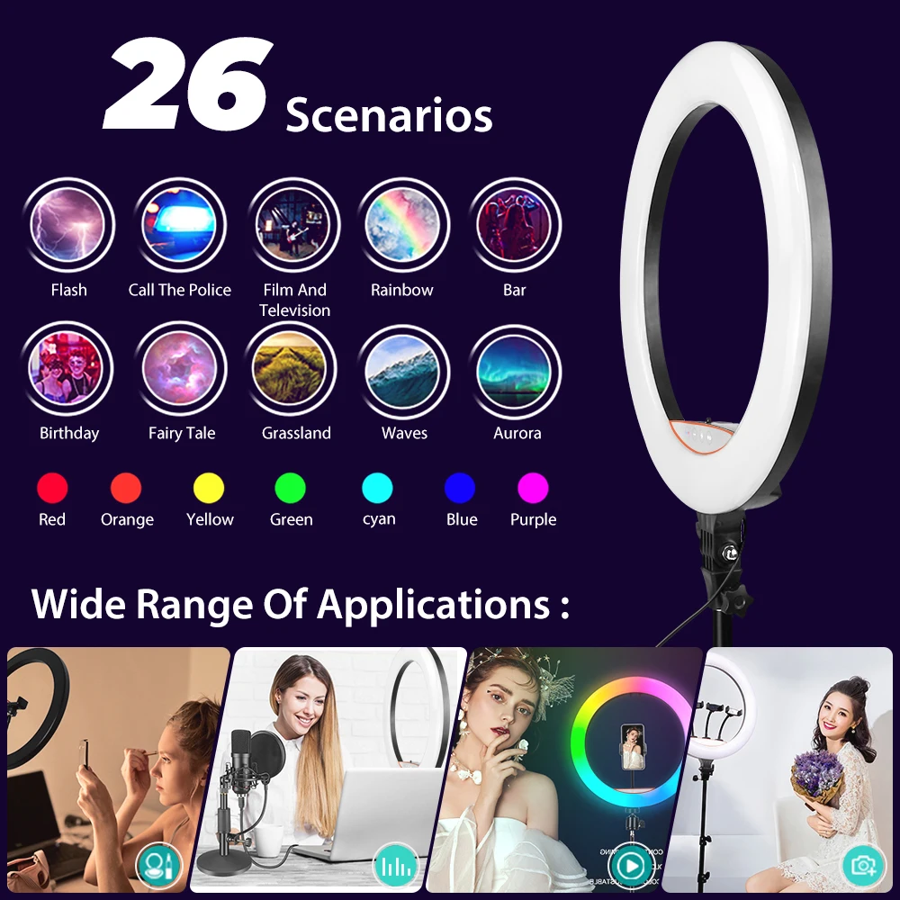 5. Кольцевой светильник RGB подходит для многих социальных целей, таких как создание, видео в режиме реального времени, студийный светильник для фотосъемки.