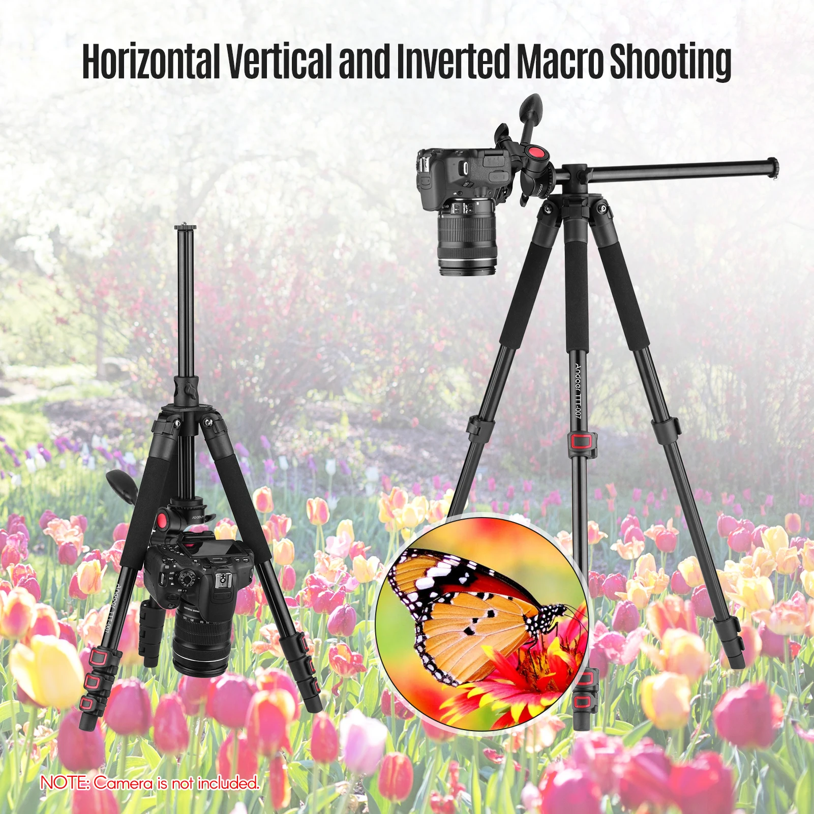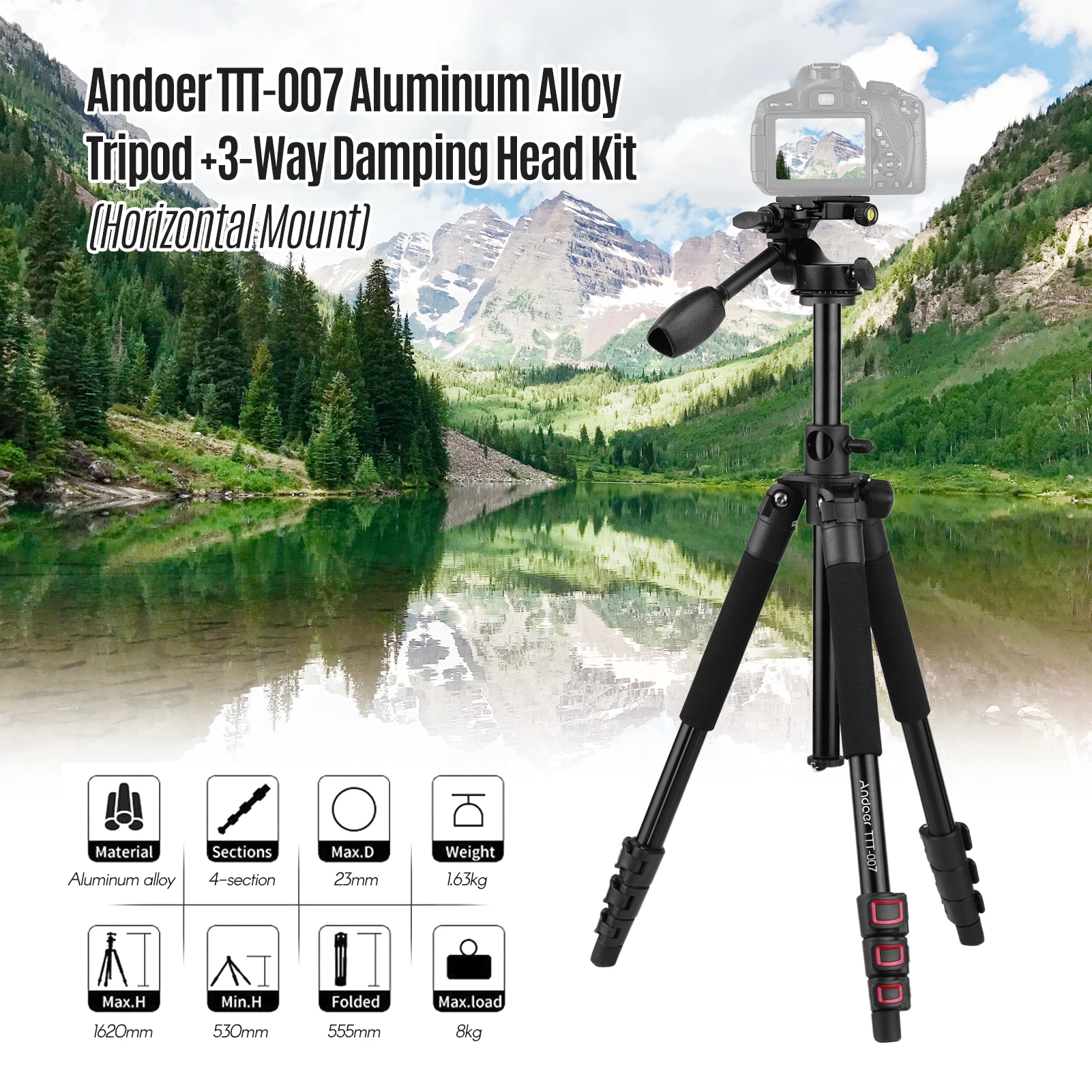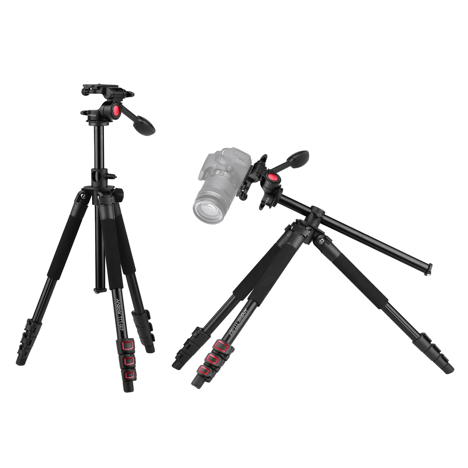 Принять флип дизайн пряжки на 4-секционный штатив с раздвижными ногами и регулируемый центральная колонка, высота штатива может быть легко регулировать от 53 см до 162 см. Его высота в сложенном виде составляет всего 55,5 см, очень портативный.